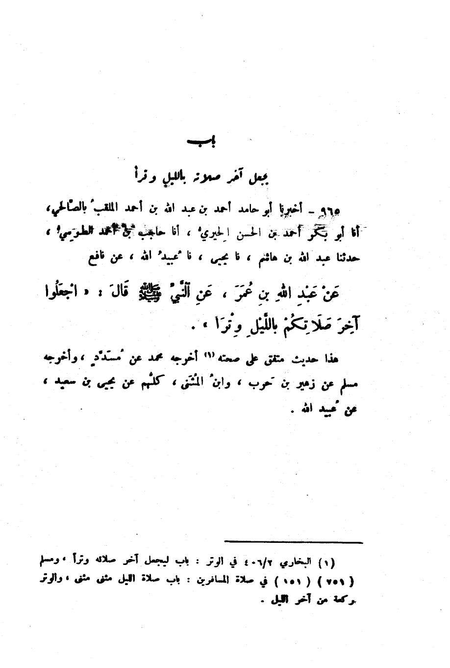 965 - أَخْبَرَنَا أَبُو حَامِدٍ أَحْمَدُ بْنُ عَبْدِ اللَّهِ بْنِ أَحْمَدَ الْمُلَقَّبُ بِالصَّالِحِيِّ، أَنا أَبُو بَكْرٍ أَحْمَدُ بْنُ الْحَسَنِ الْحِيرِيُّ، أَنا حَاجِبُ بْنُ أَحْمَدَ الطُّوسِيُّ، حَدَّثَنَا عَبْدُ اللَّهِ بْنُ هَاشِمٍ، نَا يَحْيَى، نَا عُبَيْدُ اللَّهِ، عَنْ نَافِعٍ، عَنْ عَبْدِ اللَّهِ بْنِ عُمَرَ، عَنِ النَّبِيِّ صَلَّى اللهُ عَلَيْهِ وَسَلَّمَ، قَالَ: «اجْعَلُوا آخِرَ صَلاتِكُمْ بِاللَّيْلِ وِتْرًا».