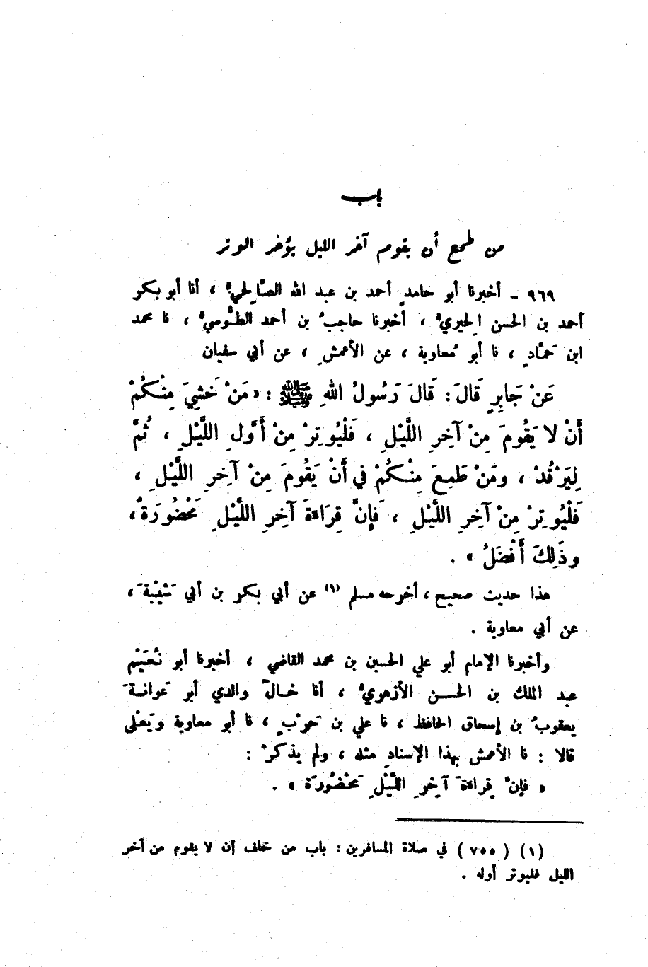 969 - أَخْبَرَنَا أَبُو حَامِدِ أَحْمَدُ بْنُ عَبْدِ اللَّهِ الصَّالِحِيُّ، أَنا أَبُو بَكْرٍ أَحْمَدُ بْنُ الْحَسَنِ الْحِيرِيُّ، أَخْبَرَنَا حَاجِبُ بْنُ أَحْمَدَ الطُّوسِيُّ، نَا مُحَمَّدُ بْنُ حَمَّادٍ، نَا أَبُو مُعَاوِيَةَ، عَنِ الأَعْمَشِ، عَنْ أَبِي سُفْيَانَ، عَنْ جَابِرٍ، قَالَ: قَالَ رَسُولُ اللَّهِ صَلَّى اللهُ عَلَيْهِ وَسَلَّمَ: «مَنْ خَشِيَ مِنْكُمْ أَنْ لَا يَقُومَ مِنْ آخِرِ اللَّيْلِ، فَلْيُوتِرْ مِنْ أَوَّلِ اللَّيْلِ، ثُمَّ لِيَرْقُدْ، وَمَنْ طَمِعَ مِنْكُمْ فِي أَنْ يَقُومَ مِنْ آخِرِ اللَّيْلِ، فَلْيُوتِرْ مِنْ آخِرِ اللَّيْلِ، فَإِنَّ قِرَاءَةَ آخِرِ اللَّيْلِ مَحْضُورَةٌ، وَذَلِكَ أَفْضَلُ».