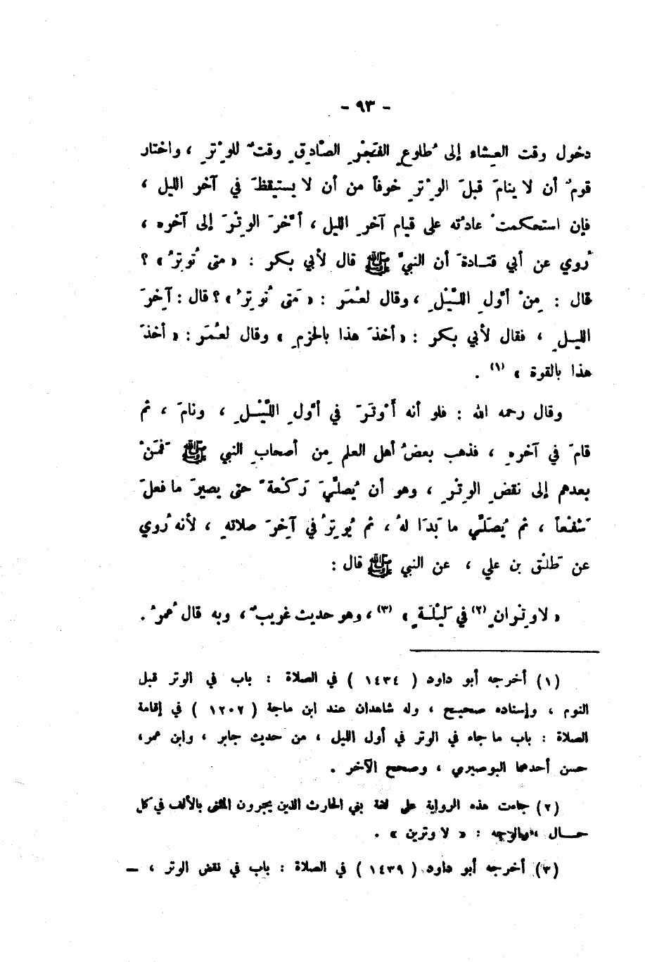 وَقَالَ رَحِمَهُ اللَّهُ: فَلَوْ أَنَّهُ أَوْتَرَ فِي أَوَّلِ اللَّيْلِ، وَنَامَ، ثُمَّ قَامَ فِي آخِرِهِ، فَذَهَبَ بَعْضُ أَهْلِ الْعِلْمِ مِنْ أَصْحَابِ النَّبِيِّ صَلَّى اللهُ عَلَيْهِ وَسَلَّمَ، فَمَنْ بَعْدَهُمْ إِلَى نَقْضِ الْوِتْرِ، وَهُوَ أَنْ يُصَلِّيَ رَكْعَةً حَتَّى يَصِيرَ مَا فَعَلَ شَفْعًا، ثُمَّ يُصَلِّي مَا بَدَا لَهُ، ثُمَّ يُوتِرُ فِي آخِرِ صَلاتِهِ، لأَنَّهُ رُوِيَ عَنْ طَلْقِ بْنِ عَلِيٍّ، عَنِ النَّبِيِّ صَلَّى اللهُ عَلَيْهِ وَسَلَّمَ، قَالَ: «لَا وِتْرَانِ فِي لَيْلَةٍ»، وَهُوَ حَدِيثٌ غَرِيبٌ، وَبِهِ قَالَ عُمَرُ.