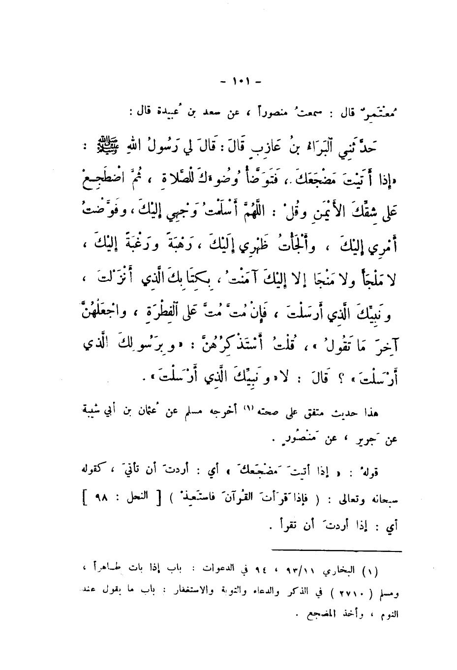 مُعْتَمِرٌ، قَالَ: سَمِعْتُ مَنْصُورًا، عَنْ سَعْدِ بْنِ عُبَيْدَةَ، قَالَ: حَدَّثَنِي الْبَرَاءُ بْنُ عَازِبٍ، قَالَ: قَالَ لِي رَسُولُ اللَّهِ صَلَّى اللهُ عَلَيْهِ وَسَلَّمَ: " إِذَا أَتَيْتَ مَضْجَعَكَ، فَتَوَضَّأْ وُضُوءَكَ لِلصَّلاةِ، ثُمَّ اضْطَجِعْ عَلَى شِقِّكَ الأَيْمَنِ وَقُلِ: اللَّهُمَّ أَسْلَمْتُ وَجْهِي إِلَيْكَ، وَفَوَّضْتُ أَمْرِي إِلَيْكَ، وَأَلْجَأْتُ ظَهْرِي إِلَيْكَ، رَهْبَةً وَرَغْبَةً إِلَيْكَ، لَا مَلْجَأَ وَلا مَنْجَا إِلا إِلَيْكَ، آمَنْتُ بِكِتَابِكَ الَّذِي أَنْزَلْتَ، وَنَبِيِّكَ الَّذِي أَرْسَلْتَ، فَإِنْ مُتَّ مُتَّ عَلَى الْفِطْرَةِ، وَاجْعَلْهُنَّ آخِرَ مَا تَقُولُ "، قُلْتُ أَسْتَذْكِرُهُنَّ: وَبِرَسُولِكَ الَّذِي أَرْسَلْتَ؟ قَالَ: «لَا وَنَبِيِّكَ الَّذِي أَرْسَلْتَ».