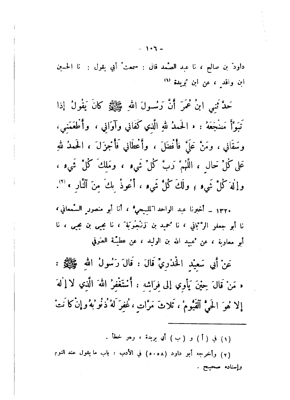 دَاوُدَ بْنِ صَالِحٍ، نَا عَبْدُ الصَّمَدِ، قَالَ: سَمِعْتُ أَبِي، يَقُولُ: نَا الْحُسَيْنُ بْنُ وَاقِدٍ، عَنِ ابْنِ بُرَيْدَةَ، حَدَّثَنِي ابْنُ عُمَرَ، أَنّ رَسُولَ اللَّهِ صَلَّى اللهُ عَلَيْهِ وَسَلَّمَ كَانَ يَقُولُ إِذَا تَبَوَّأَ مَضْجَعَهُ: «الْحَمْدُ لِلَّهِ الَّذِي كَفَانِي، وَآوَانِي، وَأَطْعَمَنِي، وَسَقَانِي، وَمَنَّ عَلَيَّ فَأَفْضَلَ، وَأَعْطَانِي فَأَجْزَلَ، الْحَمْدُ لِلَّهِ عَلَى كُلِّ حَالٍ، اللَّهُمَّ رَبَّ كُلِّ شَيْءٍ، وَمَلِكَ كُلِّ شَيْءٍ، وَإِلَهَ كُلِّ شَيْءٍ، وَلَكَ كُلُّ شَيْءٍ، أَعُوذُ بِكَ مِنَ النَّارِ»