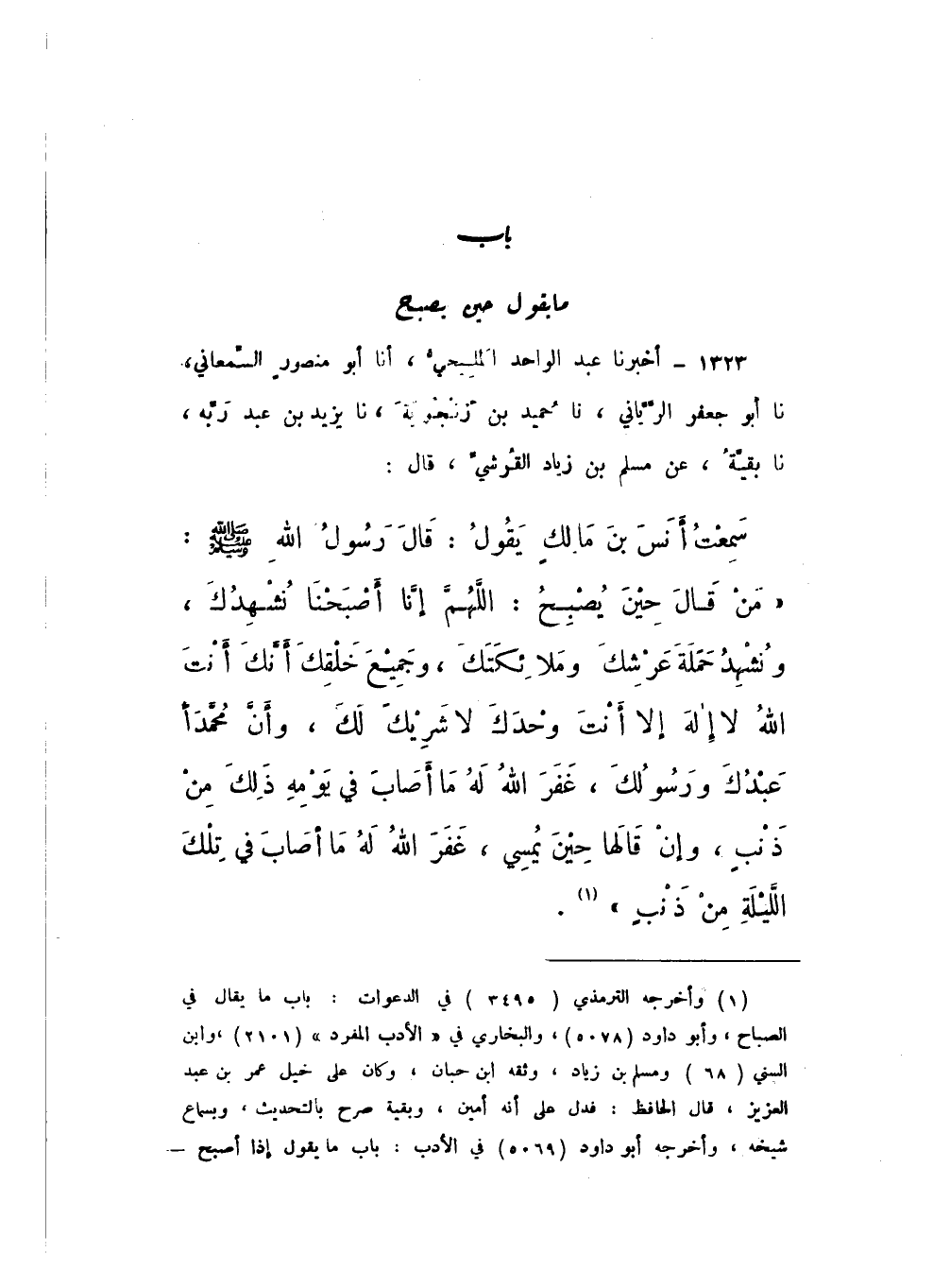 1323 - أَخْبَرَنَا عَبْدُ الْوَاحِدِ الْمَلِيحِيُّ، أَنا أَبُو مَنْصُورٍ السَّمْعَانِيُّ، نَا أَبُو جَعْفَرٍ الرَّيَّانِيُّ، نَا حُمَيْدُ بْنُ زَنْجُوَيْهِ، نَا يَزِيدُ بْنُ عَبْدِ رَبِّهِ، نَا بَقِيَّةُ، عَنْ مُسْلِمِ بْنِ زِيَادٍ الْقُرَشِيِّ، قَالَ: سَمِعْتُ أَنَسَ بْنَ مَالِكٍ، يَقُولُ: قَالَ رَسُولُ اللَّهِ صَلَّى اللهُ عَلَيْهِ وَسَلَّمَ: " مَنْ قَالَ حِينَ يُصْبِحُ: اللَّهُمَّ إِنَّا أَصْبَحْنَا نُشْهِدُكَ وَنُشْهِدُ حَمَلَةَ عَرْشِكَ وَمَلائِكَتَكَ، وَجَمِيعَ خَلْقِكَ، أَنَّكَ أَنْتَ اللَّهُ لَا إِلَهَ إِلا أَنْتَ وَحْدَكَ لَا شَرِيكَ لَكَ، وَأَنَّ مُحَمَّدًا عَبْدُكَ وَرَسُولُكَ، غَفَرَ اللَّهُ لَهُ مَا أَصَابَ فِي يَوْمِهِ ذَلِكَ مِنْ ذَنْبٍ، وَإِنْ قَالَهَا حِينَ يُمْسِي، غَفَرَ اللَّهُ لَهُ مَا أَصَابَ فِي تِلْكَ اللَّيْلَةِ مِنْ ذَنْبٍ ".