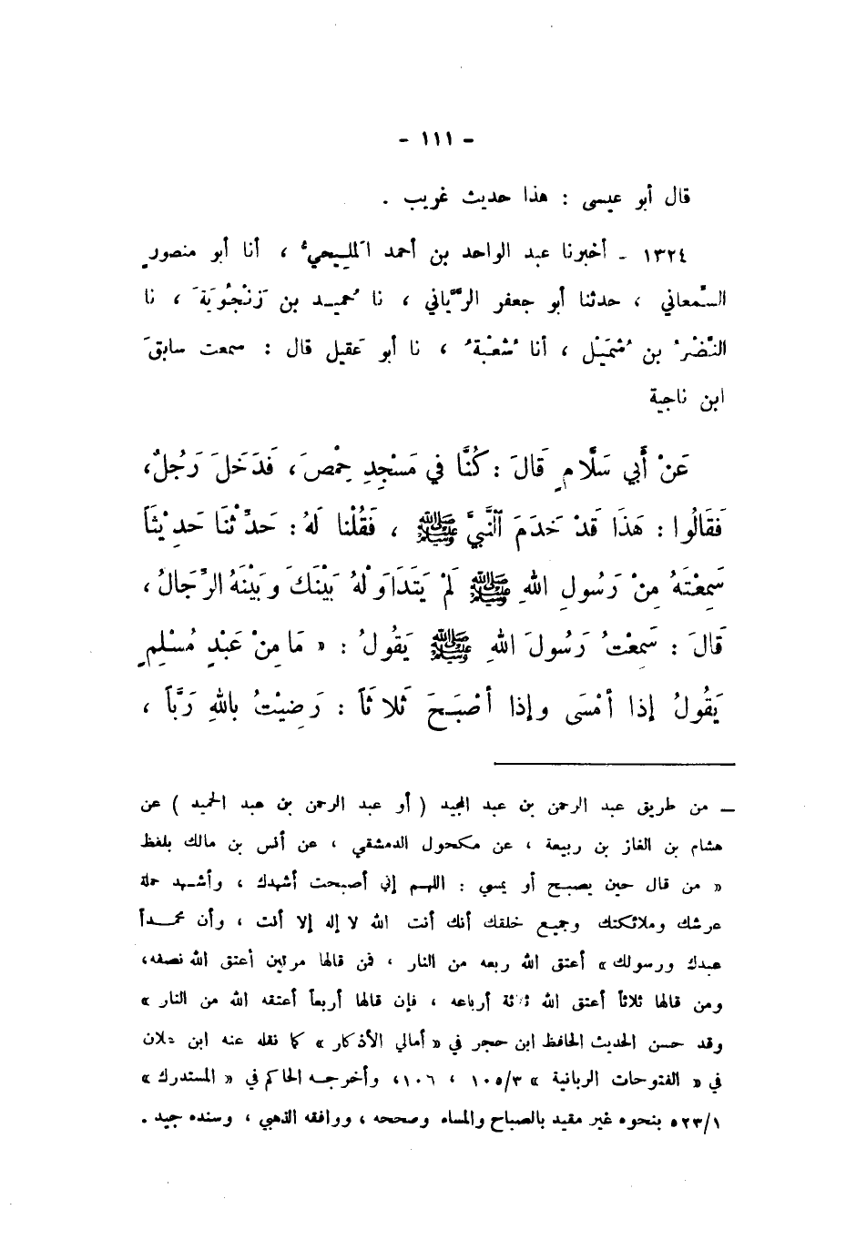 1324 - أَخْبَرَنَا عَبْدُ الْوَاحِدِ بْنُ أَحْمَدَ الْمَلِيحِيُّ، أَنا أَبُو مَنْصُورٍ السَّمْعَانِيُّ، حَدَّثَنَا أَبُو جَعْفَرٍ الرَّيَّانِيُّ، نَا حُمَيْدُ بْنُ زَنْجُوَيْهِ، نَا النَّضْرُ بْنُ شُمَيْلٍ، أَنا شُعْبَةُ، نَا أَبُو عَقِيلٍ، قَالَ: سَمِعْتُ سَابِقَ بْنَ نَاجِيَةَ، عَنْ أَبِي سَلامٍ، قَالَ: كُنَّا فِي مَسْجِدِ حِمْصَ، فَدَخَلَ رَجُلٌ، فَقَالُوا: هَذَا قَدْ خَدَمَ النَّبِيَّ صَلَّى اللهُ عَلَيْهِ وَسَلَّمَ، فَقُلْنَا لَهُ: حَدِّثْنَا حَدِيثًا سَمِعْتَهُ مِنْ رَسُولِ اللَّهِ صَلَّى اللهُ عَلَيْهِ وَسَلَّمَ لَمْ يَتَدَاوَلْهُ بَيْنَكَ وَبَيْنَهُ الرِّجَالُ، قَالَ: سَمِعْتُ رَسُولَ اللَّهِ صَلَّى اللهُ عَلَيْهِ وَسَلَّمَ، يَقُولُ: " مَا مِنْ عَبْدٍ مُسْلِمٍ يَقُولُ إِذَا أَمْسَى وَإِذَا أَصْبَحَ ثَلاثًا: رَضِيتُ بِاللَّهِ رَبًّا،