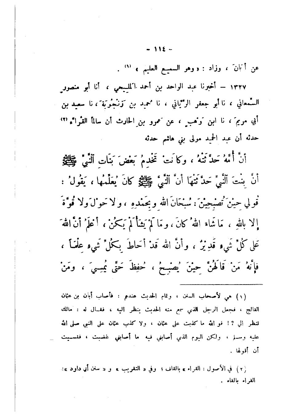 1327 - أَخْبَرَنَا عَبْدُ الْوَاحِدِ بْنُ أَحْمَدَ الْمَلِيحِيُّ، أَنا أَبُو مَنْصُورٍ السَّمْعَانِيُّ، نَا أَبُو جَعْفَرٍ الرَّيَّانِيُّ، نَا حُمَيْدُ بْنُ زَنْجُوَيْهِ، نَا سَعِيدُ بْنُ أَبِي مَرْيَمَ، نَا ابْنُ وَهْبٍ، عَنْ عَمْرِو بْنِ الْحَارِثِ، أَنَّ سَالِمًا الْقَرَّاءُ، حَدَّثَهُ أَنَّ عَبْدَ الْحَمِيدِ مَوْلَى بَنِي هَاشِمٍ، حَدَّثَهُ، أَنَّ أُمَّهُ، حَدَّثَتْهُ وَكَانَتْ تَخْدِمُ بَعْضَ بَنَاتِ النَّبِيِّ صَلَّى اللهُ عَلَيْهِ وَسَلَّمَ، أَنَّ بِنْتَ النَّبِيِّ صَلَّى اللهُ عَلَيْهِ وَسَلَّمَ، حَدَّثَتْهَا أَنَّ النَّبِيَّ صَلَّى اللهُ عَلَيْهِ وَسَلَّمَ كَانَ يُعَلِّمُهَا، يَقُولُ: " قُولِي حِينَ تُصْبِحِينَ: سُبْحَانَ اللَّهِ وَبِحَمْدِهِ، وَلا حَوْلَ وَلا قُوَّةَ إِلا بِاللَّهِ، مَا شَاءَ اللَّهُ كَانَ، وَمَا لَمْ يَشَأْ لَمْ يَكُنْ، أَعْلَمُ أَنَّ اللَّهَ عَلَى كُلِّ شَيْءٍ قَدِيرٌ، وَأَنَّ اللَّهَ قَدْ أَحَاطَ بِكُلِّ شَيْءٍ عِلْمًا، فَإِنَّهُ مَنْ قَالَهُنَّ حِينَ يُصْبِحُ، حُفِظَ حَتَّى يُمْسِيَ، وَمَنْ
