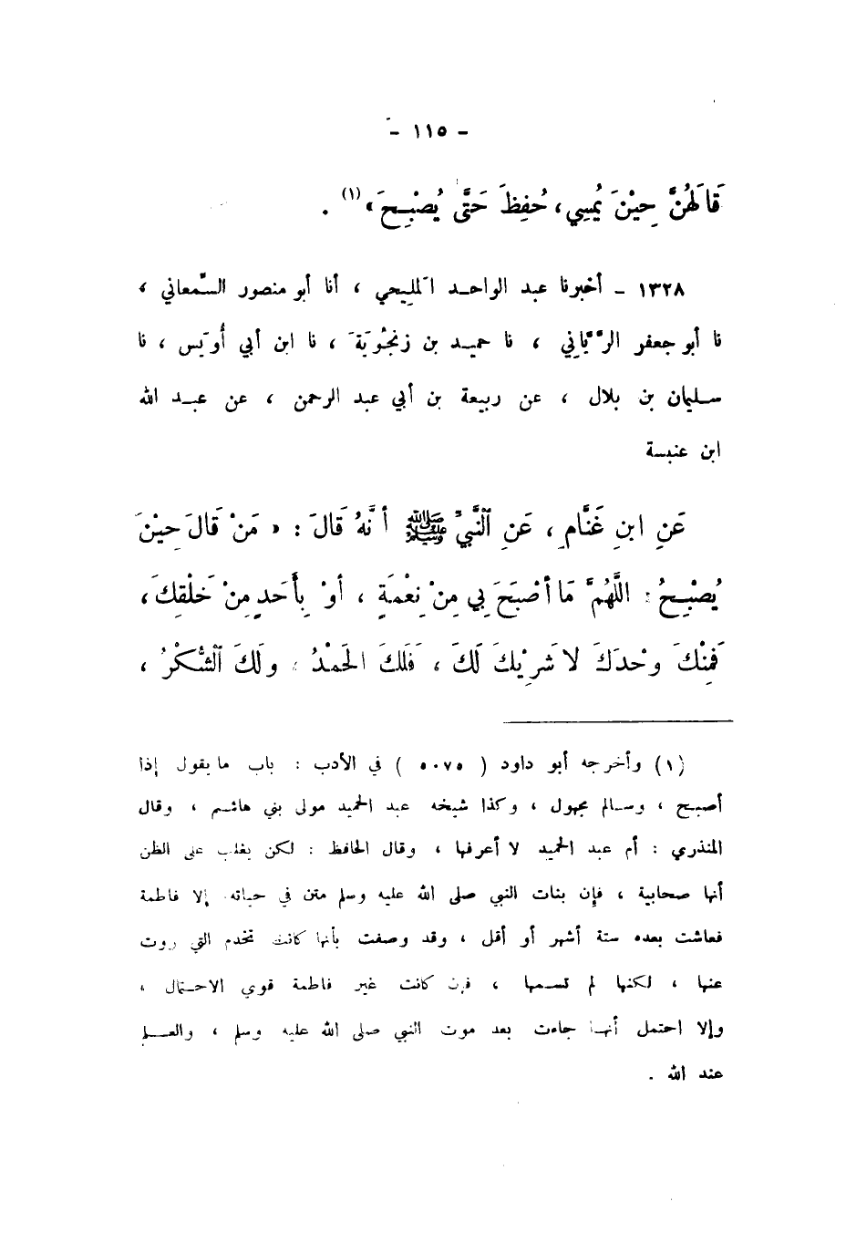 1328 - أَخْبَرَنَا عَبْدُ الْوَاحِدِ الْمَلِيحِيُّ، أَنا أَبُو مَنْصُورٍ السَّمْعَانِيُّ، نَا أَبُو جَعْفَرٍ الرَّيَّانِيُّ، نَا حُمَيْدُ بْنُ زَنْجُوَيْهِ، نَا ابْنُ أَبِي أُوَيْسٍ، نَا سُلَيْمَانُ بْنُ بِلالٍ، عَنْ رَبِيعَةَ بْنِ أَبِي عَبْدِ الرَّحْمَنِ، عَنْ عَبْدِ اللَّهِ بْنِ عَنْبَسَةَ، عَنِ ابْنِ غَنَّامٍ، عَنِ النَّبِيِّ صَلَّى اللهُ عَلَيْهِ وَسَلَّمَ، أَنَّهُ قَالَ: " مَنْ قَالَ حِينَ يُصبِحُ: اللَّهُمَّ مَا أَصْبَحَ بِي مِنْ نِعْمَةٍ، أَوْ بِأَحَدٍ مِنْ خَلْقِكَ، فَمِنْكَ وَحْدَكَ لَا شَرِيكَ لَكَ، فَلَكَ الْحَمْدُ، وَلَكَ الشُّكْرُ،