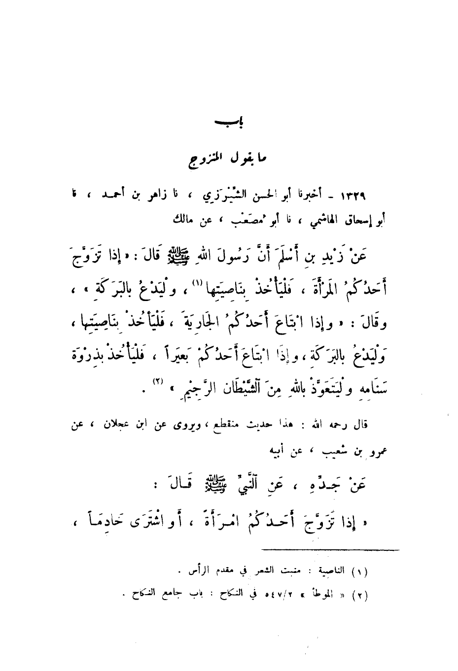 1329 - أَخْبَرَنَا أَبُو الْحَسَنِ الشِّيرَزِيُّ، نَا زَاهِرُ بْنُ أَحْمَدَ، نَا أَبُو إِسْحَاقَ الْهَاشِمِيُّ، نَا أَبُو مُصْعَبٍ، عَنْ مَالِكٍ، عَنْ زَيْدِ بْنِ أَسْلَمَ، أَنّ رَسُولَ اللَّهِ صَلَّى اللهُ عَلَيْهِ وَسَلَّمَ، قَالَ: «إِذَا تَزَوَّجَ أَحَدُكُمُ الْمَرْأَةَ، فَلْيَأْخُذْ بِنَاصِيَتِهَا، وَلْيَدْعُ بِالْبَرَكَةِ»، وَقَالَ: «وَإِذَا ابْتَاعَ أَحَدُكُمُ الْجَارِيَةَ، فَلْيَأْخُذْ بِنَاصِيَتِهَا، وَلْيَدْعُ بِالْبَرَكَةِ، وَإِذَا ابْتَاعَ أَحَدُكُمْ بَعِيرًا، فَلْيَأْخُذْ بِذِرْوَةِ سَنَامِهِ وَلْيَتَعَوَّذْ بِاللَّهِ مِنَ الشَّيْطَانِ الرَّجِيمِ».