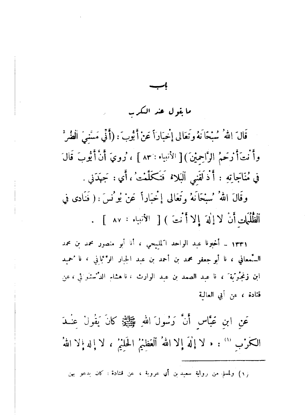 1331 - أَخْبَرَنَا عَبْدُ الْوَاحِدِ الْمَلِيحِيُّ، أَنا أَبُو مَنْصُورٍ مُحَمَّدُ بْنُ مُحَمَّدٍ السَّمْعَانِيُّ، نَا أَبُو جَعْفَرٍ مُحَمَّدُ بْنُ أَحْمَدَ بْنِ عَبْدِ الْجَبَّارِ الرَّيَّانِيُّ، نَا حُمَيْدُ بْنُ زَنْجُوَيْهِ، نَا عَبْدُ الصَّمَدِ بْنُ عَبْدِ الْوَارِثِ، نَا هِشَامٌ الدَّسْتُوائِيُّ، عَنْ قَتَادَةَ، عَنْ أَبِي الْعَالِيَةِ، عَنِ ابْنِ عَبَّاسٍ، أَنّ رَسُولَ اللَّهِ صَلَّى اللهُ عَلَيْهِ وَسَلَّمَ كَانَ، يَقُولُ عِنْدَ الْكَرْبِ: «لَا إِلَهَ إِلا اللَّهُ الْعَظِيمُ الْحَلِيمُ، لَا إِلَهَ إِلا اللَّهُ