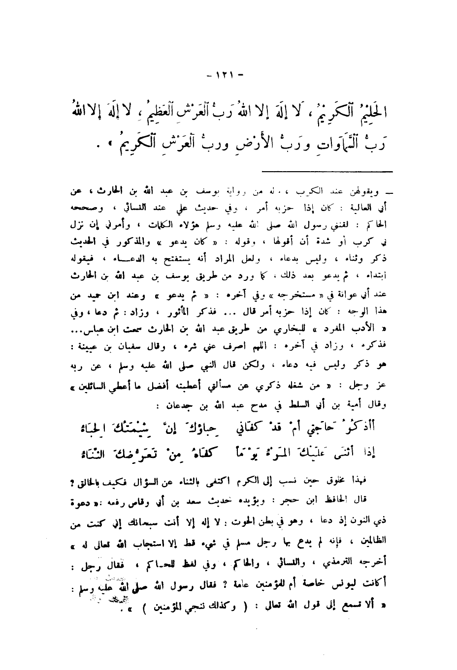 الْحَلِيمُ الْكَرِيمُ، لَا إِلَهَ إِلا اللَّهُ رَبُّ الْعَرْشِ الْعَظِيمُ، لَا إِلَهَ إِلا اللَّهُ، رَبُّ السَّمَوَاتِ، وَرَبُّ الأَرْضِ، وَرَبُّ الْعَرْشِ الْكَرِيمُ».