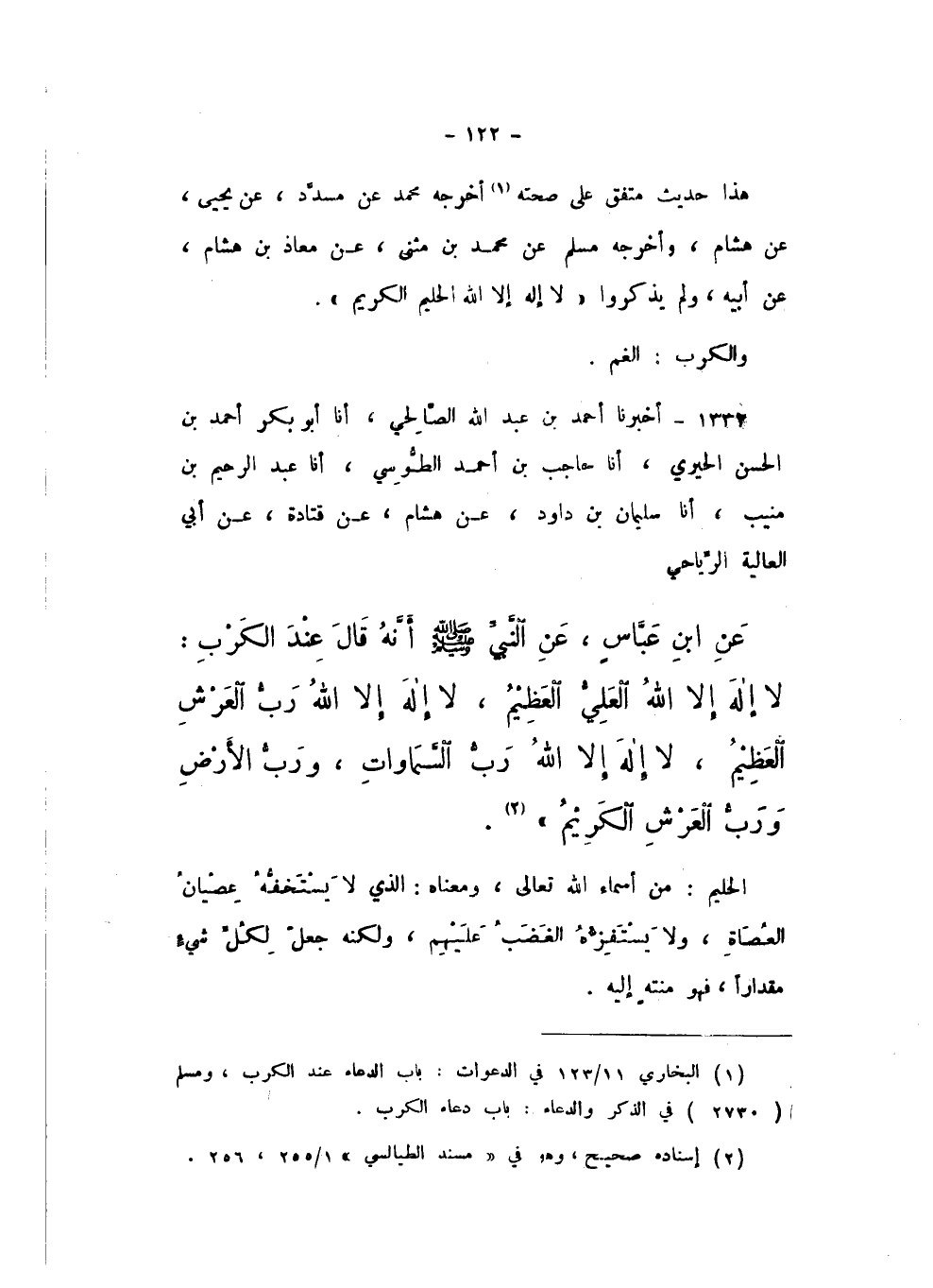 1332 - أَخْبَرَنَا أَحْمَدُ بْنُ عَبْدِ اللَّهِ الصَّالِحِيُّ، أَنا أَبُو بَكْرٍ أَحْمَدُ بْنُ الْحَسَنِ الْحِيرِيُّ، أَنا حَاجِبُ بْنُ أَحْمَدَ الطُّوسِيُّ، أَنا عَبْدُ الرَّحِيمِ بْنُ مُنِيبٍ، أَنا سُلَيْمَانُ بْنُ دَاوُدَ، عَنْ هِشَامٍ، عَنْ قَتَادَةَ، عَنْ أَبِي الْعَالِيَةِ الرِّيَاحِيُّ، عَنِ ابْنِ عَبَّاسٍ، عَنِ النَّبِيِّ صَلَّى اللهُ عَلَيْهِ وَسَلَّمَ، أَنَّهُ قَالَ عِنْدَ الْكَرْبِ: «لَا إِلَهَ إِلا اللَّهُ الْعَلِيُّ الْعَظِيمُ، لَا إِلَهَ إِلا اللَّهُ رَبُّ الْعَرْشِ الْعَظِيمُ، لَا إِلَهَ إِلا اللَّهُ رَبُّ السَّمَوَاتِ، وَرَبُّ الأَرْضِ وَرَبُّ الْعَرْشِ الْكَرِيمُ».