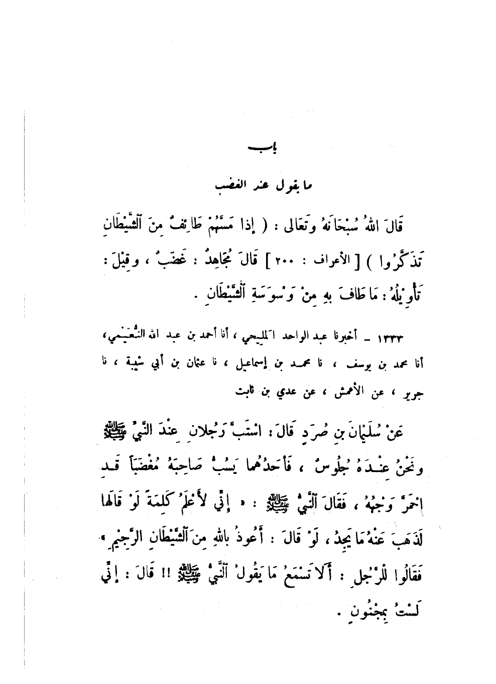 1333 - أَخْبَرَنَا عَبْدُ الْوَاحِدِ الْمَلِيحِيُّ، أَنا أَحْمَدُ بْنُ عَبْدِ اللَّهِ النُّعَيْمِيُّ، أَنا مُحَمَّدُ بْنُ يُوسُفَ، نَا مُحَمَّدُ بْنُ إِسْمَاعِيلَ، نَا عُثْمَانُ بْنُ أَبِي شَيْبَةَ، نَا جَرِيرٌ، عَنِ الأَعْمَشِ، عَنْ عَدِيِّ بْنِ ثَابِتٍ، عَنْ سُلَيْمَانَ بْنِ صُرَدٍ، قَالَ: اسْتَبَّ رَجُلانِ عِنْدَ النَّبِيِّ صَلَّى اللهُ عَلَيْهِ وَسَلَّمَ، وَنَحْنُ عِنْدَهُ جُلُوسٌ، فَأَحَدُهُمَا يَسُبُّ صَاحِبَهُ مُغْضَبًا قَدِ احْمَرَّ وَجْهَهُ، فَقَالَ النَّبِيُّ صَلَّى اللهُ عَلَيْهِ وَسَلَّمَ: " إِنِّي لأَعْلَمُ كَلِمَةً لَوْ قَالَهَا لَذَهَبَ عَنْهُ مَا يَجِدُ، لَوْ قَالَ: أَعُوذُ بِاللَّهِ مِنَ الشَّيْطَانِ الرَّجِيمِ "، فَقَالُوا لِلرَّجُلِ: أَلا تَسْمَعُ مَا يَقُولُ النَّبِيُّ صَلَّى اللهُ عَلَيْهِ وَسَلَّمَ!! قَالَ: إِنِّي لَسْتُ بِمَجْنُونٍ.