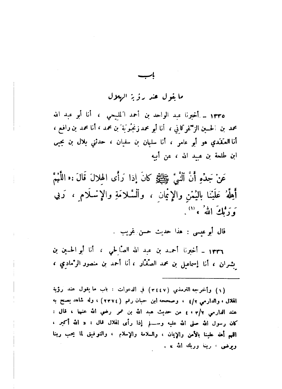 1335 - أَخْبَرَنَا عَبْدُ الْوَاحِدِ بْنُ أَحْمَدَ الْمَلِيحِيُّ، أَنا أَبُو عَبْدِ اللَّهِ مُحَمَّدُ بْنُ الْحُسَيْنِ الزَّغْرَتَانِيُّ، أَنا أَبُو مُحَمَّدٍ زَنْجُوَيْهِ بْنُ مُحَمَّدٍ، أَنا مُحَمَّدُ بْنُ رَافِعٍ، أَنا الْعَقَدِيُّ هُوَ أَبُو عَامِرٍ، أَنا سُلَيْمَانُ بْنُ سُفْيَانَ، حَدَّثَنِي بِلالُ بْنُ يَحْيَى بْنِ طَلْحَةَ بْنِ عُبَيْدِ اللَّهِ، عَنْ أَبِيهِ، عَنْ جَدِّهِ، أَنّ النَّبِيَّ صَلَّى اللهُ عَلَيْهِ وَسَلَّمَ كَانَ إِذَا رَأَى الْهِلالَ، قَالَ: «اللَّهُمَّ أَهِلَّهُ عَلَيْنَا بِالْيُمْنِ وَالإِيمَانِ، وَالسَّلامَةِ وَالإِسْلامِ، رَبِّي وَرَبُّكَ اللَّهُ».