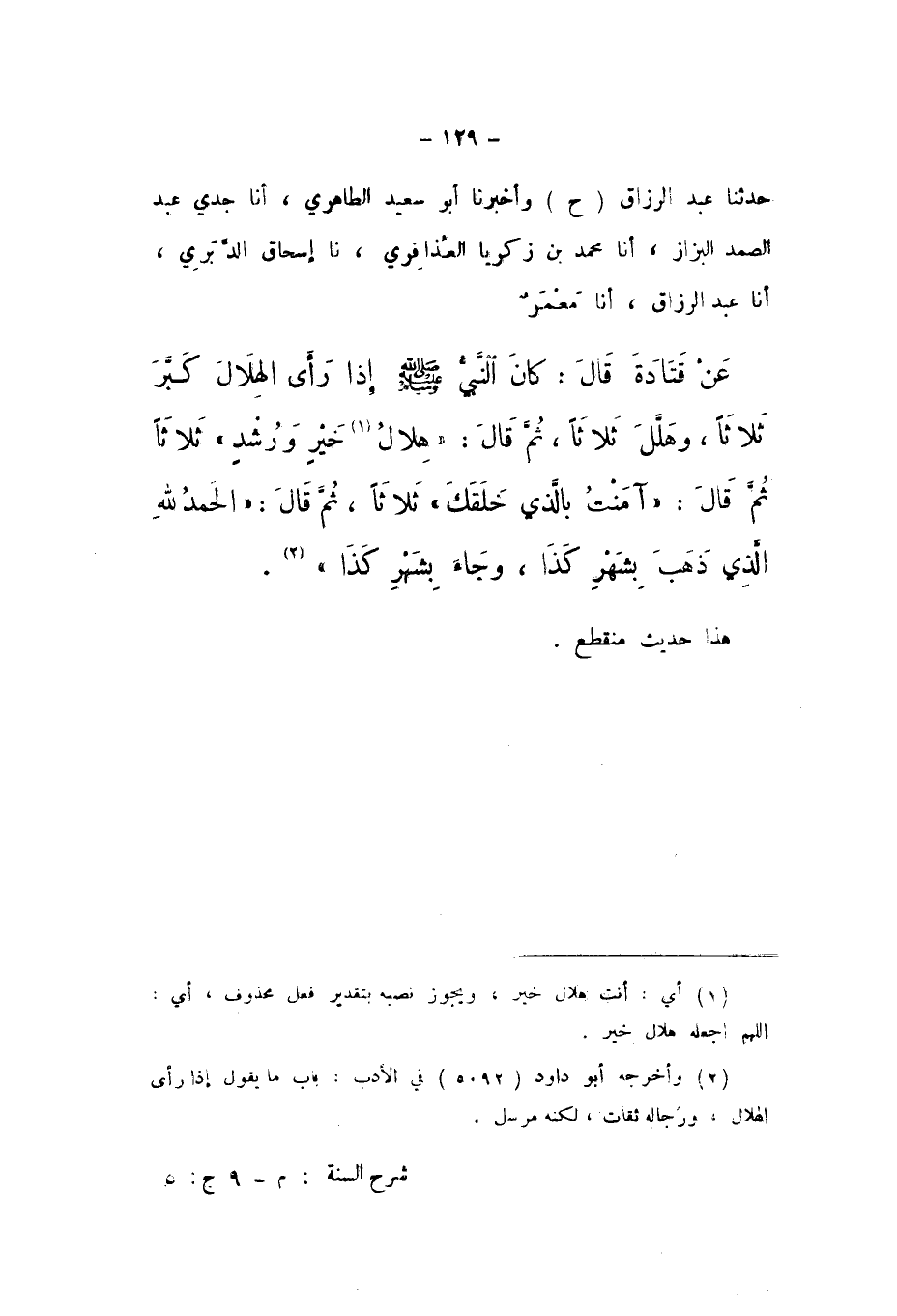 ح وَأَخْبَرَنَا أَبُو سَعِيدٍ الطَّاهِرِيُّ، أَنا جَدِّي عَبْدُ الصَّمَدِ الْبَزَّازُ، أَنا مُحَمَّدُ بْنُ زَكَرِيَّا الْعُذَافِرِيُّ، نَا إِسْحَاقُ الدَّبَرِيُّ، أَنا عَبْدُ الرَّزَّاقِ، أَنا مَعْمَرٌ، عَنْ قَتَادَةَ، قَالَ: كَانَ النَّبِيُّ صَلَّى اللهُ عَلَيْهِ وَسَلَّمَ إِذَا رَأَى الْهِلالَ كَبَّرَ ثَلاثًا، وَهَلَّلَ ثَلاثًا، ثُمَّ قَالَ: «هِلالُ خَيْرٍ وَرُشْدٍ» ثَلاثًا، ثُمَّ قَالَ: «آمَنْتُ بِالَّذِي خَلَقَكَ» ثَلاثًا، ثُمَّ قَالَ: «الْحَمْدُ لِلَّهِ الَّذِي ذَهَبَ بِشَهْرِ كَذَا، وَجَاءَ بِشَهْرِ كَذَا».