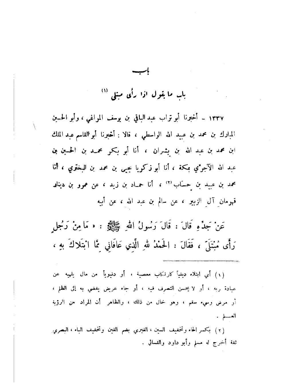 1337 - أَخْبَرَنَا أَبُو تُرَابٍ عَبْدُ الْبَاقِي بْنُ يُوسُفَ الْمَرَاغِيُّ، وَأَبُو الْحُسَيْنِ الْمُبَاركُ بْنُ مُحَمَّدِ بْنِ عُبَيْدِ اللَّهِ الْوَاسِطِيُّ، قَالا: أَخْبَرَنَا أَبُو الْقَاسِمِ عَبْدُ الْمَلِكِ بْنُ مُحَمَّدِ بْنِ عَبْدِ اللَّهِ بْنِ بِشْرَانَ، أَنا أَبُو بَكْرٍ مُحَمَّدُ بْنُ الْحُسَيْنِ بْنِ عَبْدِ اللَّهِ الآجُرِّيُّ، بِمَكَّةَ، أَنا أَبُو زَكَرِيَّا يَحْيَى بْنُ مُحَمَّدِ بْنِ الْبَخْتَرِيِّ، أَنا مُحَمَّدُ بْنُ عُبَيْدِ بْنِ حِسَابٍ، أَنا حَمَّادُ بْنُ زَيْدٍ، عَنْ عَمْرِو بْنِ دِينَارٍ قَهْرَمَانِ آلِ الزُّبَيْرِ، عَنْ سَالِمِ بْنِ عَبْدِ اللَّهِ، عَنْ أَبِيهِ، عَنْ جَدِّهِ، قَالَ: قَالَ رَسُولُ اللَّهِ صَلَّى اللهُ عَلَيْهِ وَسَلَّمَ: " مَا مِنْ رَجُلٍ رَأَى مُبْتَلًى، فَقَالَ: الْحَمْدُ لِلَّهِ الَّذِي عَافَانِي مِمَّا ابْتَلاكَ بِهِ،