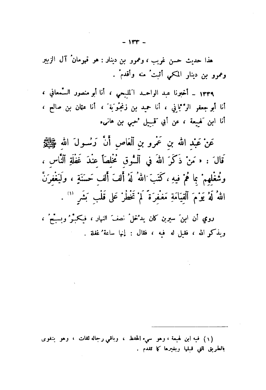 1339 - أَخْبَرَنَا عَبْدُ الْوَاحِدِ الْمَلِيحِيُّ، أَنا أَبُو مَنْصُورٍ السَّمْعَانِيُّ، أَنا أَبُو جَعْفَرٍ الرَّيَّانِيُّ، أَنا حُمَيْدُ بْنُ زَنْجُوَيْهِ، أَنا عُثْمَانُ بْنُ صَالِحٍ، أَنا ابْنُ لَهِيعَةَ، عَنْ أَبِي قَبِيلٍ حُيَيِّ بْنِ هَانِئٍ، عَنْ عَبْدِ اللَّهِ بْنِ عَمْرِو بْنِ الْعَاصِ، أَنّ رَسُولَ اللَّهِ صَلَّى اللهُ عَلَيْهِ وَسَلَّمَ، قَالَ: «مَنْ ذَكَرَ اللَّهَ فِي السُّوقِ مُخْلِصًا عِنْدَ غَفْلَةِ النَّاسِ، وَشُغْلِهِمْ بِمَا هُمْ فِيهِ، كَتَبَ اللَّهُ لَهُ أَلْفَ أَلْفِ حَسَنَةٍ، وَلَيَغْفِرَنَّ اللَّهُ لَهُ يَوْمَ الْقِيَامَةِ مَغْفِرَةً لَمْ تَخْطُرْ عَلَى قَلْبِ بَشَرٍ»