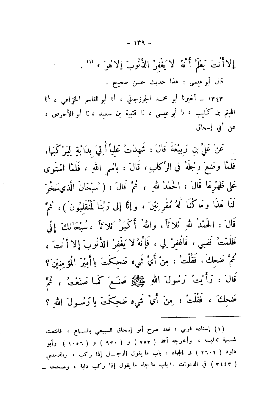 1343 - أَخْبَرَنَا أَبُو مُحَمَّدٍ الْجَوْزَجَانِيُّ، أَنا أَبُو الْقَاسِمِ الْخُزَاعِيُّ، أَنا الْهَيْثَمُ بْنُ كُلَيْبٍ، نَا أَبُو عِيسَى، نَا قُتَيْبَةُ بْنُ سَعِيدٍ، نَا أَبُو الأَحْوَصِ، عَنْ أَبِي إِسْحَاقَ، عَنْ عَلِيِّ بْنِ رَبِيعَةَ، قَالَ: شَهِدْتُ عَلِيًّا أُتِيَ بِدَابَّةٍ لِيَرْكَبَهَا، فَلَمَّا وَضَعَ رِجْلَهُ فِي الرِّكَابِ، قَالَ: " بِاسْمِ اللَّهِ، فَلَمَّا اسْتَوَى عَلَى ظَهْرِهَا، قَالَ: الْحَمْدُ لِلَّهِ، ثُمَّ قَالَ: {سُبْحَانَ الَّذِي سَخَّرَ لَنَا هَذَا وَمَا كُنَّا لَهُ مُقْرِنِينَ {13} وَإِنَّا إِلَى رَبِّنَا لَمُنْقَلِبُونَ {14}} [الزخرف: 13 - 14]، ثُمَّ قَالَ: الْحَمْدُ لِلَّهِ ثَلاثًا، وَاللَّهُ أَكْبَرُ ثَلاثًا، سُبْحَانَكَ إِنِّي ظَلَمْتُ نَفْسِي، فَاغْفِرْ لِي، فَإِنَّهُ لَا يَغْفِرُ الذُّنُوبَ إِلا أَنْتَ، ثُمَّ ضَحِكَ "، فَقُلْتُ: مِنْ أَيِّ شَيْءٍ ضَحِكْتَ يَا أَمِيرَ الْمُؤْمِنِينَ؟ قَالَ: رَأَيْتُ رَسُولَ اللَّهِ صَلَّى اللهُ عَلَيْهِ وَسَلَّمَ صَنَعَ كَمَا صَنَعْتُ، ثُمَّ ضَحِكَ، فَقُلْتُ: مِنْ أَيِّ شَيْءٍ ضَحِكْتَ يَا رَسُولَ اللَّهِ؟