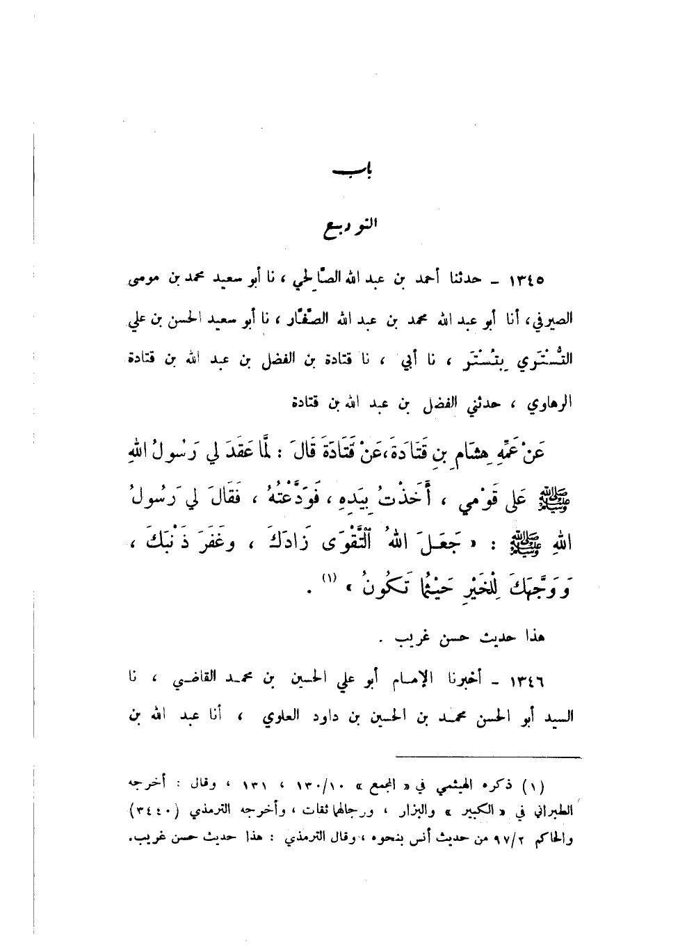 1345 - حَدَّثَنَا أَحْمَدُ بْنُ عَبْدِ اللَّهِ الصَّالِحِيُّ، نَا أَبُو سَعِيدٍ مُحَمَّدُ بْنُ مُوسَى الصَّيْرَفِيُّ، أَنا أَبُو عَبْدِ اللَّهِ مُحَمَّدُ بْنُ عَبْدِ اللَّهِ الصَّفَّارُ، نَا أَبُو سَعِيدٍ الْحَسَنُ بْنُ عَلِيٍّ التُّسْتَرِيُّ، بِتُسْتَرَ، نَا أَبِي، نَا قَتَادَةُ بْنُ الْفَضْلِ بْنِ عَبْدِ اللَّهِ بْنِ قَتَادَةَ الرُّهَاوِيُّ، حَدَّثَنِي الْفَضْلُ بْنُ عَبْدِ اللَّهِ بْنِ قَتَادَةَ، عَنْ عَمِّهِ هِشَامِ بْنِ قَتَادَةَ، عَنْ قَتَادَةَ، قَالَ: لَمَّا عَقَدَ لِي رَسُولُ اللَّهِ صَلَّى اللهُ عَلَيْهِ وَسَلَّمَ عَلَى قَوْمِي، أَخَذْتُ بِيَدِهِ، فَوَدَّعْتُهُ، فَقَالَ لِي رَسُولُ اللَّهِ صَلَّى اللهُ عَلَيْهِ وَسَلَّمَ: «جَعَلَ اللَّهُ التَّقْوَى زَادَكَ، وَغَفَرَ ذَنْبَكَ، وَوَجَّهَكَ لِلْخَيْرِ حَيْثُمَا تَكُونُ».