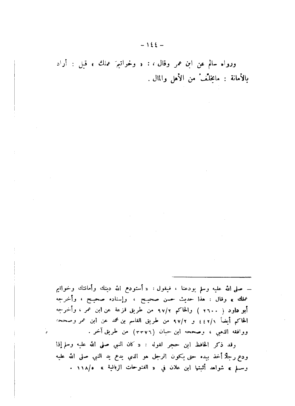 وَرَوَاهُ سَالِمٌ، عَنِ ابْنِ عُمَرَ، وَقَالَ: «وَخَوَاتِيمَ عَمَلِكَ»، قِيلَ: أَرَادَ بِالأَمَانَةِ مَا يُخَلِّفُ مِنَ الأَهْلِ وَالْمَالِ.