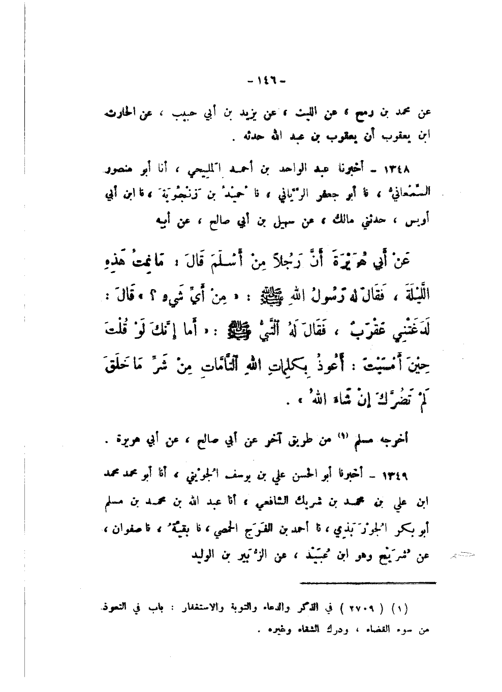 1348 - أَخْبَرَنَا عَبْدُ الْوَاحِدِ بْنُ أَحْمَدَ الْمَلِيحِيُّ، أَنا أَبُو مَنْصُورٍ السَّمْعَانِيُّ، نَا أَبُو جَعْفَرٍ الرَّيَّانِيُّ، نَا حُمَيْدُ بْنُ زَنْجُوَيْهِ، نَا ابْنُ أَبِي أُوَيْسٍ، حَدَّثَنِي مَالِكٌ، عَنْ سُهَيْلِ بْنِ أَبِي صَالِحٍ، عَنْ أَبِيهِ، عَنْ أَبِي هُرَيْرَةَ، أَنَّ رَجُلا مِنْ أَسْلَمَ، قَالَ: مَا نِمْتُ هَذِهِ اللَّيْلَةَ، فَقَالَ لَهُ رَسُولُ اللَّهِ صَلَّى اللهُ عَلَيْهِ وَسَلَّمَ: «مِنْ أَيِّ شَيْءٍ؟»، قَالَ: لَدَغَتْنِي عَقْرَبٌ، فَقَالَ لَهُ النَّبِيُّ صَلَّى اللهُ عَلَيْهِ وَسَلَّمَ: " أَمَا إِنَّكَ لَوْ قُلْتَ حِينَ أَمْسَيْتَ: أَعُوذُ بِكَلِمَاتِ اللَّهِ التَّامَّاتِ مِنْ شَرِّ مَا خَلَقَ , لَمْ تَضُرَّكَ إِنْ شَاءَ اللَّهُ ".