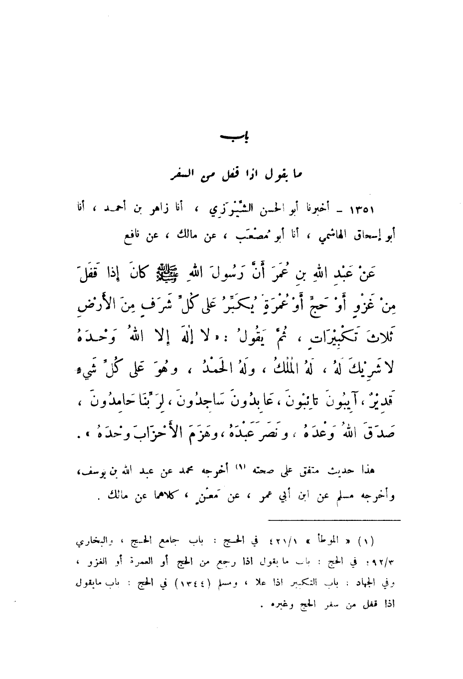 1351 - أَخْبَرَنَا أَبُو الْحَسَنِ الشِّيرَزِيُّ، أَنا زَاهِرُ بْنُ أَحْمَدَ، أَنا أَبُو إِسْحَاقَ الْهَاشِمِيُّ، أَنا أَبُو مُصْعَبٍ، عَنْ مَالِكٍ، عَنْ نَافِعٍ، عَنْ عَبْدِ اللَّهِ بْنِ عُمَرَ، أَنّ رَسُولَ اللَّهِ صَلَّى اللهُ عَلَيْهِ وَسَلَّمَ كَانَ إِذَا قَفَلَ مِنْ غَزْوٍ، أَوْ حَجٍّ، أَوْ عُمْرَةٍ، «يُكَبِّرُ عَلَى كُلِّ شَرَفٍ مِنَ الأَرْضِ ثَلاثَ تَكْبِيرَاتٍ»، ثُمَّ يَقُولُ: «لَا إِلَهَ إِلا اللَّهُ وَحْدَهُ لَا شَرِيكَ لَهُ، لَهُ الْمُلْكُ، وَلَهُ الْحَمْدُ، وَهُوَ عَلَى كُلِّ شَيْءٍ قَدِيرٌ، آيِبُونَ تَائِبُونَ، عَابِدُونَ سَاجِدُونَ، لِرَبِّنَا حَامِدُونَ، صَدَقَ اللَّهُ وَعْدَهُ، وَنصَرَ عَبْدَهُ، وَهَزَمَ الأَحْزَابَ وَحْدَهُ».