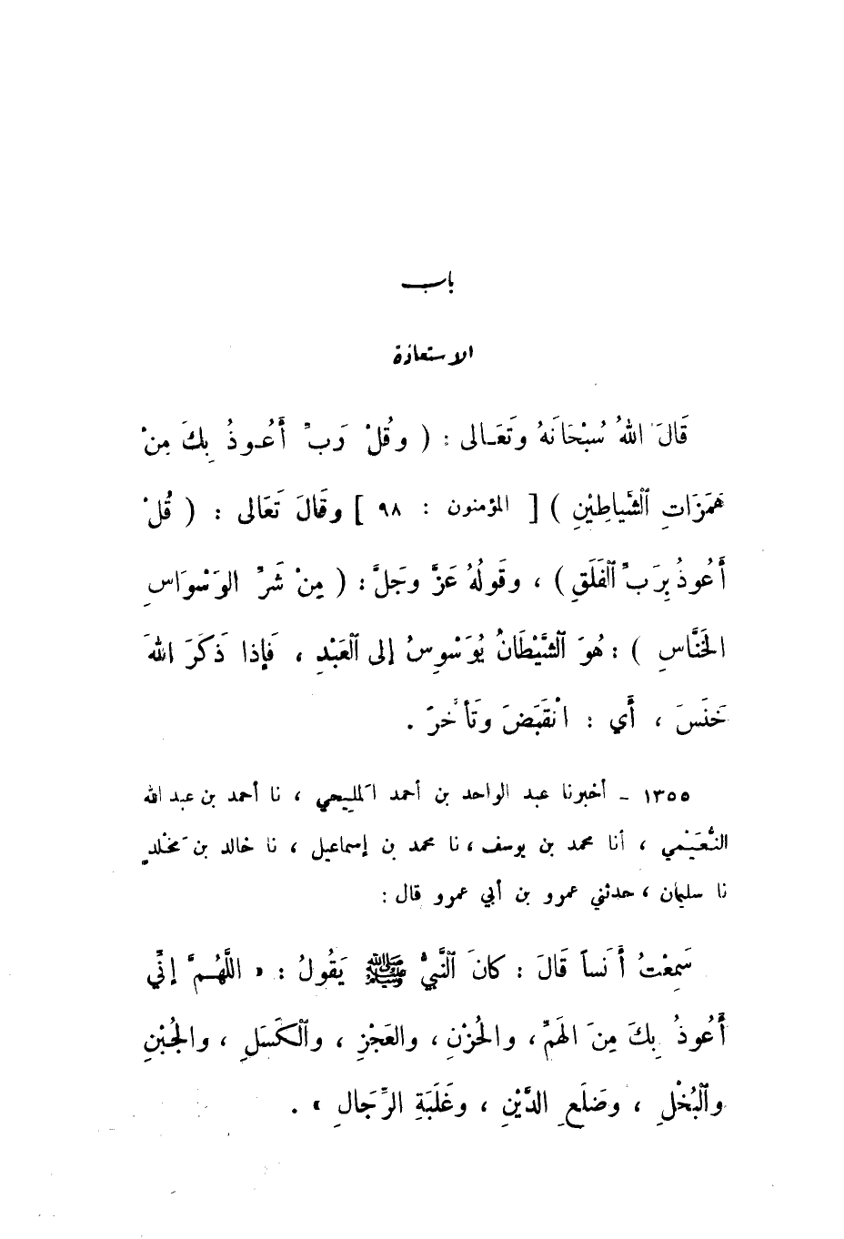 قَالَ اللَّهُ سُبْحَانَهُ وَتَعَالَى: {وَقُلْ رَبِّ أَعُوذُ بِكَ مِنْ هَمَزَاتِ الشَّيَاطِينِ} [الْمُؤْمِنُونَ: 97] وَقَالَ تَعَالَى: {قُلْ أَعُوذُ بِرَبِّ الْفَلَقِ} [الفلق: 1]، وَقَوْلُهُ عَزَّ وَجَلَّ: {مِنْ شَرِّ الْوَسْوَاسِ الْخَنَّاسِ} [النَّاس: 4]: هُوَ الشَّيْطَانُ يُوَسْوِسُ إِلَى الْعَبْدِ، فَإِذَا ذَكَرَ اللَّهَ خَنَسَ، أَيِ: انْقَبَضَ وَتَأَخَّرَ.
