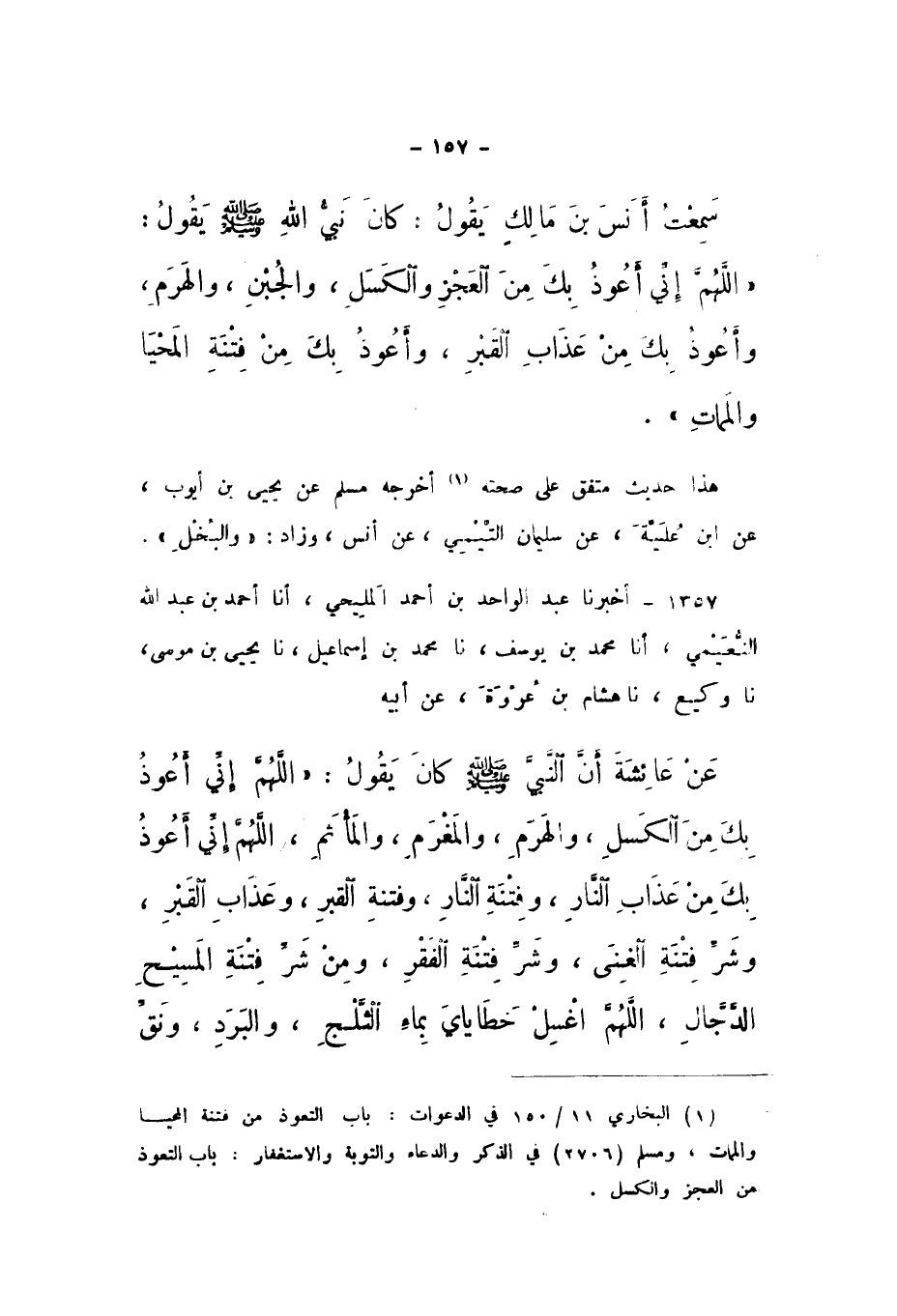 1357 - أَخْبَرَنَا عَبْدُ الْوَاحِدِ بْنُ أَحْمَدَ الْمَلِيحِيُّ، أَنا أَحْمَدُ بْنُ عَبْدِ اللَّهِ النُّعَيْمِيُّ، أَنا مُحَمَّدُ بْنُ يُوسُفَ، نَا مُحَمَّدُ بْنُ إِسْمَاعِيلَ، نَا يَحْيَى بْنُ مُوسَى، نَا وَكِيعٌ، نَا هِشَامُ بْنُ عُرْوَةَ، عَنْ أَبِيهِ، عَنْ عَائِشَةَ، أَنّ النَّبِيَّ صَلَّى اللهُ عَلَيْهِ وَسَلَّمَ كَانَ، يَقُولُ: «اللَّهُمَّ إِنِّي أَعُوذُ بِكَ مِنَ الْكَسَلِ، وَالْهَرَمِ، وَالْمَغْرَمِ، وَالْمَأْثَمِ، اللَّهُمَّ إِنِّي أَعُوذُ بِكَ مِنْ عَذَابِ النَّارِ، وَفِتْنَةِ النَّارِ، وَفِتْنَةِ الْقَبْرِ، وَعَذَابِ الْقَبْرِ، وَشَرِّ فِتْنَةِ الْغِنَى، وَشَرِّ فِتْنَةِ الْفَقْرِ، وَمِنْ شَرِّ فِتْنَةِ الْمَسِيحِ الدَّجَّالِ، اللَّهُمَّ اغْسِلْ خَطَايَايَ بِمَاءِ الثَّلْجِ، وَالْبَرَدِ، وَنَقِّ
