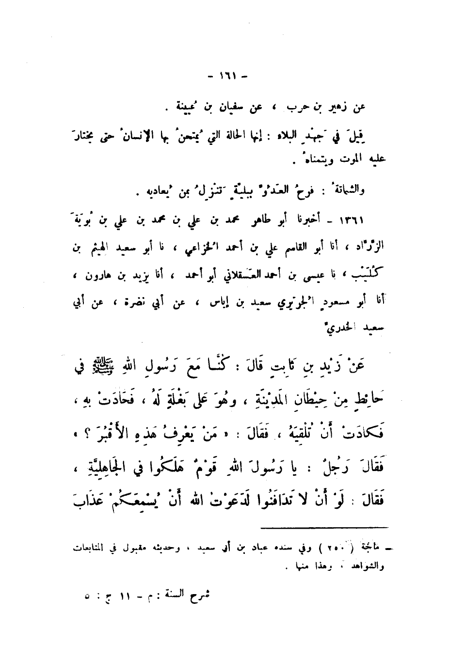 1361 - أَخْبَرَنَا أَبُو طَاهِرٍ مُحَمَّدُ بْنُ عَلِيِّ بْنِ مُحَمَّدِ بْنِ عَلِيِّ بْنِ بُوَيْهِ الزَّرَّادُ، أَنا أَبُو الْقَاسِمِ عَلِيُّ بْنُ أَحْمَدَ الْخُزَاعِيُّ، نَا أَبُو سَعِيدٍ الْهَيْثَمُ بْنُ كُلَيْبٍ، نَا عِيسَى بْنُ أَحْمَدَ الْعَسْقَلانِيُّ أَبُو أَحْمَدَ، أَنا يَزِيدُ بْنُ هَارُونَ، أَنا أَبُو مَسْعُودٍ الْجُرَيْرِيُّ سَعِيدُ بْنُ إِيَاسٍ، عَنْ أَبِي نَضْرَةَ، عَنْ أَبِي سَعِيدٍ الْخُدْرِيِّ، عَنْ زَيْدِ بْنِ ثَابِتٍ، قَالَ: كُنَّا مَعَ رَسُولِ اللَّهِ صَلَّى اللهُ عَلَيْهِ وَسَلَّمَ فِي حَائِطٍ مِنْ حِيطَانِ الْمَدِينَةِ، وَهُوَ عَلَى بَغْلَةٍ لَهُ، فَحَادَتْ بِهِ، فَكَادَتْ أَنْ تُلْقِيَهُ، فَقَالَ: «مَنْ يَعْرِفُ هَذِهِ الأَقْبُرَ؟»، فَقَالَ رَجُلٌ: يَا رَسُولَ اللَّهِ قَوْمٌ هَلَكُوا فِي الْجَاهِلِيَّةِ، فَقَالَ: «لَوْ أَنْ لَا تَدَافَنُوا لَدَعَوْتُ اللَّهَ أَنْ يُسْمِعَكُمْ عَذَابَ