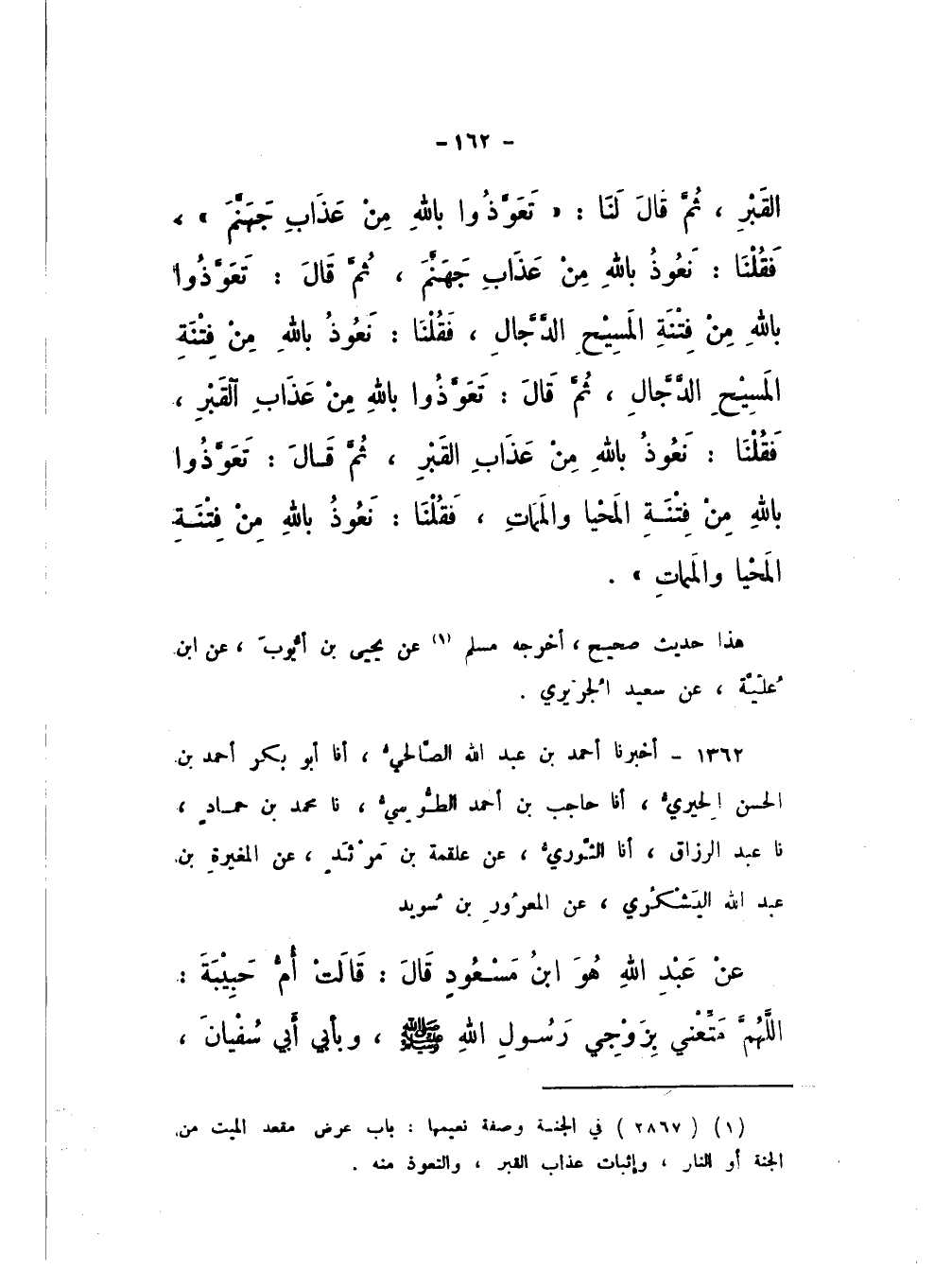 1362 - أَخْبَرَنَا أَحْمَدُ بْنُ عَبْدِ اللَّهِ الصَّالِحِيُّ، أَنا أَبُو بَكْرٍ أَحْمَدُ بْنُ الْحَسَنِ الْحِيرِيُّ، أَنا حَاجِبُ بْنُ أَحْمَدَ الطُّوسِيُّ، نَا مُحَمَّدُ بْنُ حَمَّادٍ، نَا عَبْدُ الرَّزَّاقِ، أَنا الثَّوْرِيُّ، عَنْ عَلْقَمَةَ بْنِ مَرْثَدٍ، عَنِ الْمُغِيرَةِ بْنِ عَبْدِ اللَّهِ الْيَشْكُرِيِّ، عَنِ الْمَعْرُورِ بْنِ سُوَيْدٍ، عَنْ عَبْدِ اللَّهِ هُوَ ابْنُ مَسْعُودٍ، قَالَ: قَالَتْ أُمُّ حَبِيبَةَ: اللَّهُمَّ مَتِّعْنِي بِزَوْجِي رَسُولِ اللَّهِ صَلَّى اللهُ عَلَيْهِ وَسَلَّمَ، وَبِأَبِي أَبِي سُفْيَانَ،