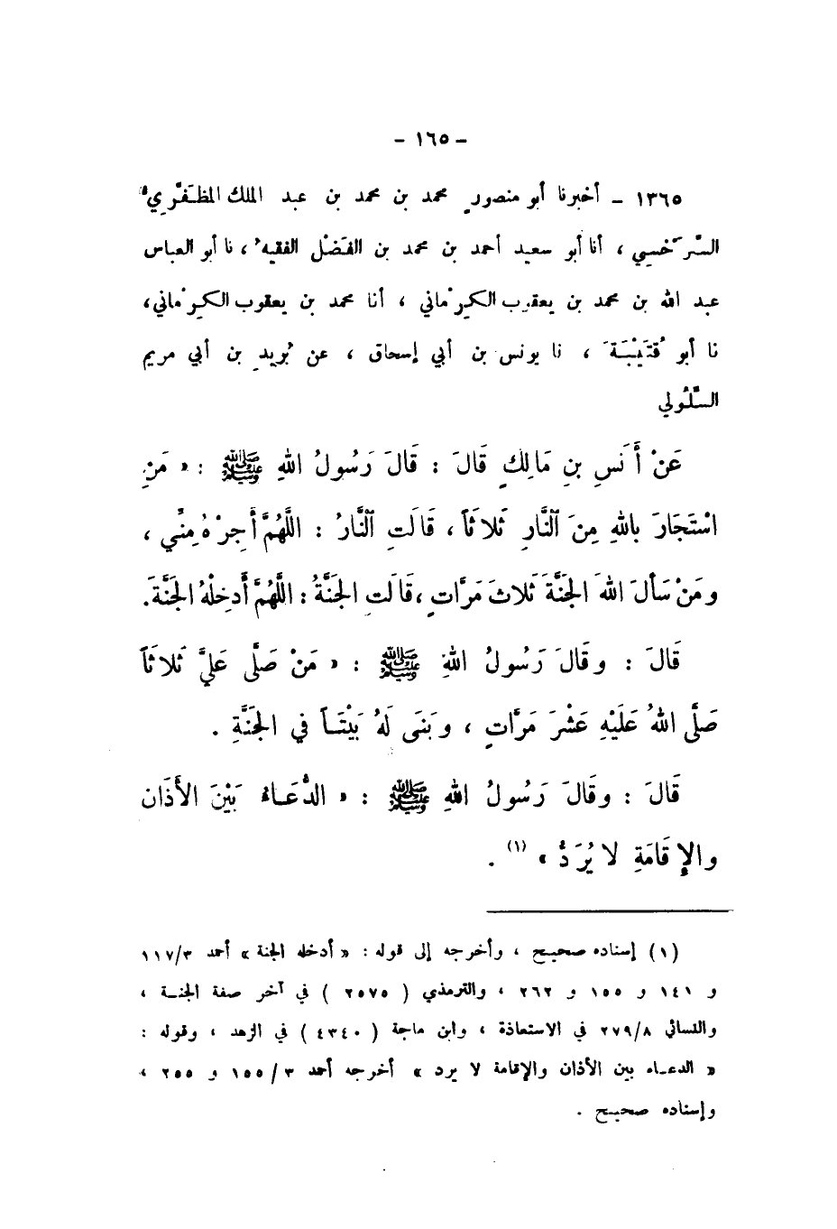 1365 - قَالَ: وَقَالَ رَسُولُ اللَّهِ صَلَّى اللهُ عَلَيْهِ وَسَلَّمَ: «الدُّعَاءُ بَيْنَ الأَذَانِ وَالإِقَامَةِ لَا يُرَدُّ».