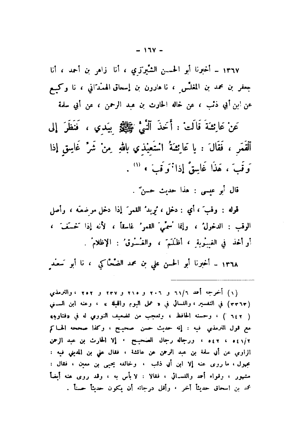 1366 - أَخْبَرَنَا أَبُو الْحَسَنِ الشِّيرَزِيُّ، أَنا زَاهِرُ بْنُ أَحْمَدَ، أَنا جَعْفَرُ بْنُ مُحَمَّدِ بْنِ الْمُغَلِّسِ، نَا هَارُونُ بْنُ إِسْحَاقَ الْهَمْدَانِيُّ، نَا وَكِيعٌ، عَنِ ابْنِ أَبِي ذِئْبٍ، عَنْ خَالِهِ الْحَارِثِ بْنِ عَبْدِ الرَّحْمَنِ، عَنْ أَبِي سَلَمَةَ، عَنْ عَائِشَةَ، قَالَتْ: أَخَذَ النَّبِيُّ صَلَّى اللهُ عَلَيْهِ وَسَلَّمَ بِيَدِي فَنَظَرَ إِلَى الْقَمَرِ، فَقَالَ: «يَا عَائِشَةُ اسْتَعِيذِي بِاللَّهِ مِنْ شَرِّ غَاسِقٍ إِذَا وَقَبَ، هَذَا غَاسِقٌ إِذَا وَقَبَ».