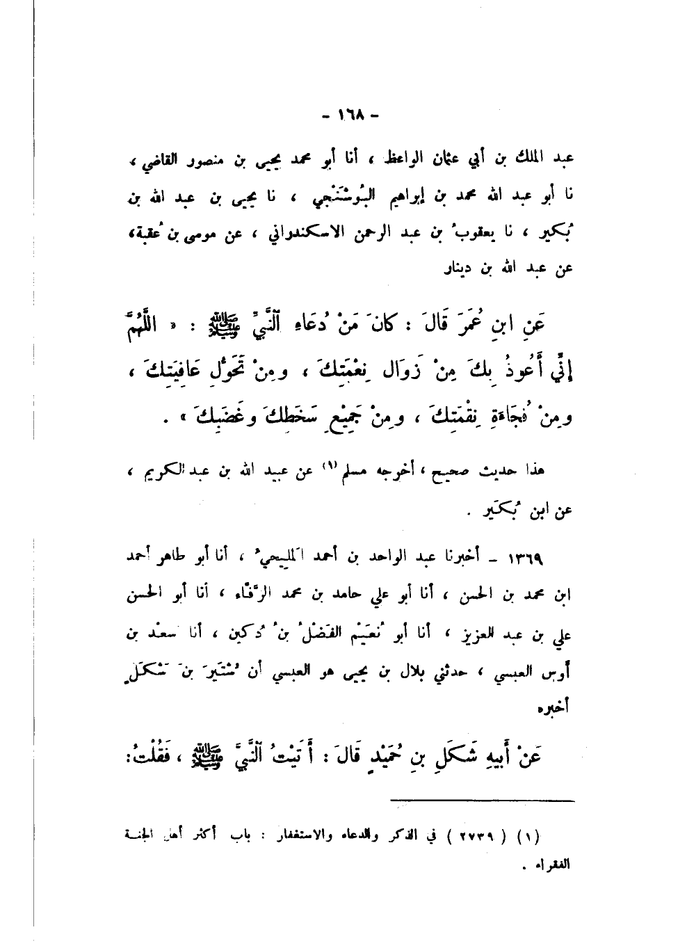عَبْدُ الْمَلِكِ بْنُ أَبِي عُثْمَانَ الْوَاعِظُ، أَنا أَبُو مُحَمَّدٍ يَحْيَى بْنُ مَنْصُورٍ الْقَاضِي، نَا أَبُو عَبْدِ اللَّهِ مُحَمَّدُ بْنُ إِبْرَاهِيمَ الْبُوشَنْجِيُّ , نَا يَحْيَى بْنُ عَبْدِ اللَّهِ بْنِ بُكَيْرٍ، نَا يَعْقُوبُ بْنُ عَبْدِ الرَّحْمَنِ الإِسْكَنْدَرَانِيُّ، عَنْ مُوسَى بْنِ عُقْبَةَ، عَنْ عَبْدِ اللَّهِ بْنِ دِينَارٍ، عَنِ ابْنِ عُمَرَ، قَالَ: كَانَ مِنْ دُعَاءِ النَّبِيِّ صَلَّى اللهُ عَلَيْهِ وَسَلَّمَ: «اللَّهُمَّ إِنِّي أَعُوذُ بِكَ مِنْ زَوَالِ نِعْمَتِكَ، وَمِنْ تَحَوُّلِ عَافِيَتِكَ، وَمِنْ فُجَاءَةِ نِقْمَتِكَ وَمِنْ جَمِيعِ سُخْطِكَ وَغَضَبِكَ».