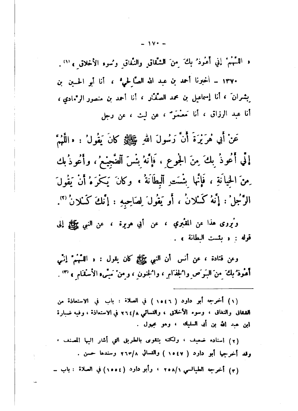 1370 - أَخْبَرَنَا أَحْمَدُ بْنُ عَبْدِ اللَّهِ الصَّالِحِيُّ، أَنا أَبُو الْحَسَنِ بْنُ بِشْرَانَ، أَنا إِسْمَاعِيلُ بْنُ مُحَمَّدٍ الصَّفَّارُ، أَنا أَحْمَدُ بْنُ مَنْصُورٍ الرَّمَادِيُّ، أَنا عَبْدُ الرَّزَّاقِ، أَنا مَعْمَرٌ، عَنْ لَيْثٍ، عَنْ رَجُلٍ، عَنْ أَبِي هُرَيْرَةَ، أَنّ رَسُولَ اللَّهِ صَلَّى اللهُ عَلَيْهِ وَسَلَّمَ، كَانَ يَقُولُ: «اللَّهُمَّ إِنِّي أَعُوذُ بِكَ مِنَ الْجُوعِ، فَإِنَّهُ بِئْسَ الضَّجِيعُ، وَأَعُوذُ بِكَ مِنَ الْخِيَانَةِ، فَإِنَّهَا بِئْسَتِ الْبِطَانَةُ».