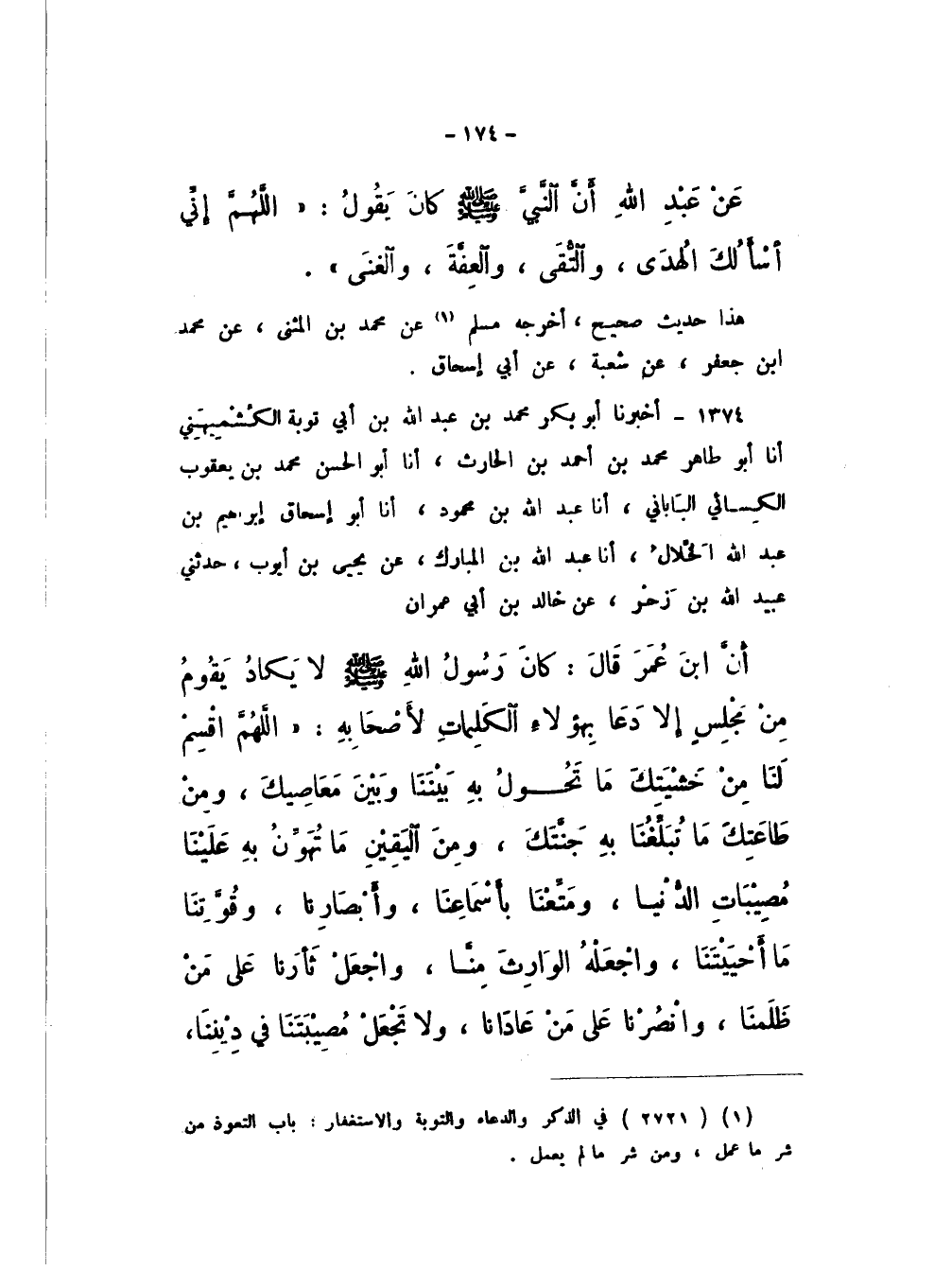 1374 - أَخْبَرَنَا أَبُو بَكْرٍ مُحَمَّدُ بْنُ عَبْدِ اللَّهِ بْنِ أَبِي تَوْبَةَ الْكُشْمِيهَنِيُّ، أَنا أَبُو طَاهِرٍ مُحَمَّدُ بْنُ أَحْمَدَ بْنِ الْحَارِثِ، أَنا أَبُو الْحَسَنِ مُحَمَّدُ بْنُ يَعْقُوبَ الْكِسَائِيُّ الْبَابَانِيُّ، أَنا عَبْدُ اللَّهِ بْنُ مَحْمُودٍ، أَنا أَبُو إِسْحَاقَ إِبْرَاهِيمُ بْنُ عَبْدِ اللَّهِ الْخَلالُ، أَنا عَبْدُ اللَّهِ بْنُ الْمُبَارَكِ، عَنْ يَحْيَى بْنِ أَيُّوبَ، حَدَّثَنِي عُبَيْدُ اللَّهِ بْنُ زَحْرٍ، عَنْ خَالِدِ بْنِ أَبِي عِمْرَانَ، أَنَّ ابْنَ عُمَرَ، قَالَ: كَانَ رَسُولُ اللَّهِ صَلَّى اللهُ عَلَيْهِ وَسَلَّمَ لَا يَكَادُ يَقُومُ مِنْ مَجْلِسٍ إِلا دَعَا بِهَؤُلاءِ الْكَلِمَاتِ لأَصْحَابِهِ: «اللَّهُمَّ اقْسِمْ لَنَا مِنْ خَشْيَتِكَ مَا تَحُولُ بِهِ بَيْنَنَا وَبَيْنَ مَعَاصِيكَ، وَمِنْ طَاعَتِكَ مَا تُبَلِّغُنَا بِهِ جَنَّتَكَ، وَمِنَ الْيَقِينِ مَا تُهَوِّنُ بِهِ عَلَيْنَا مُصِيبَاتِ الدُّنْيَا، وَمَتِّعْنَا بِأَسْمَاعِنَا، وَأَبْصَارِنَا، وَقُوَّتِنَا مَا أَحْيَيْتَنَا، وَاجْعَلْهُ الْوَارِثَ مِنَّا، وَاجْعَلْ ثَأْرَنَا عَلَى مَنْ ظَلَمَنَا، وَانْصُرْنَا عَلَى مَنْ عَادَانَا، وَلا تَجْعَلْ مُصِيبَتَنَا فِي دِينِنَا،