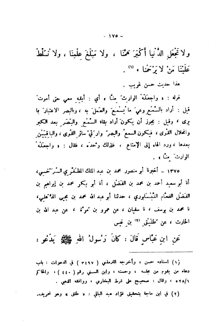 1375 - أَخْبَرَنَا أَبُو مَنْصُورٍ مُحَمَّدُ بْنُ عَبْدِ الْمَلِكِ الْمُظَفَّرِيُّ السَّرَخْسِيُّ، أَنا أَبُو سَعِيدٍ أَحْمَدُ بْنُ مُحَمَّدِ بْنِ الْفَضْلِ، أَنا أَبُو بَكْرٍ مُحَمَّدُ بْنُ إِبْرَاهِيمَ بْنِ الْفَضْلِ الْفَحَّامُ النَّيْسَابُورِيُّ، حَدَّثَنَا أَبُو عَبْدِ اللَّهِ مُحَمَّدُ بْنُ يَحْيَى الذُّهْلِيُّ، نَا مُحَمَّدُ بْنُ يُوسُفَ، نَا سُفْيَانُ، عَنْ عَمْرِو بْنِ مُرَّةَ، عَنْ عَبْدِ اللَّهِ بْنِ الْحَارِثِ، عَنْ طُلَيْقِ بْنِ قَيْسٍ، عَنِ ابْنِ عَبَّاسٍ، قَالَ: كَانَ رَسُولُ اللَّهِ صَلَّى اللهُ عَلَيْهِ وَسَلَّمَ يَدْعُو: «