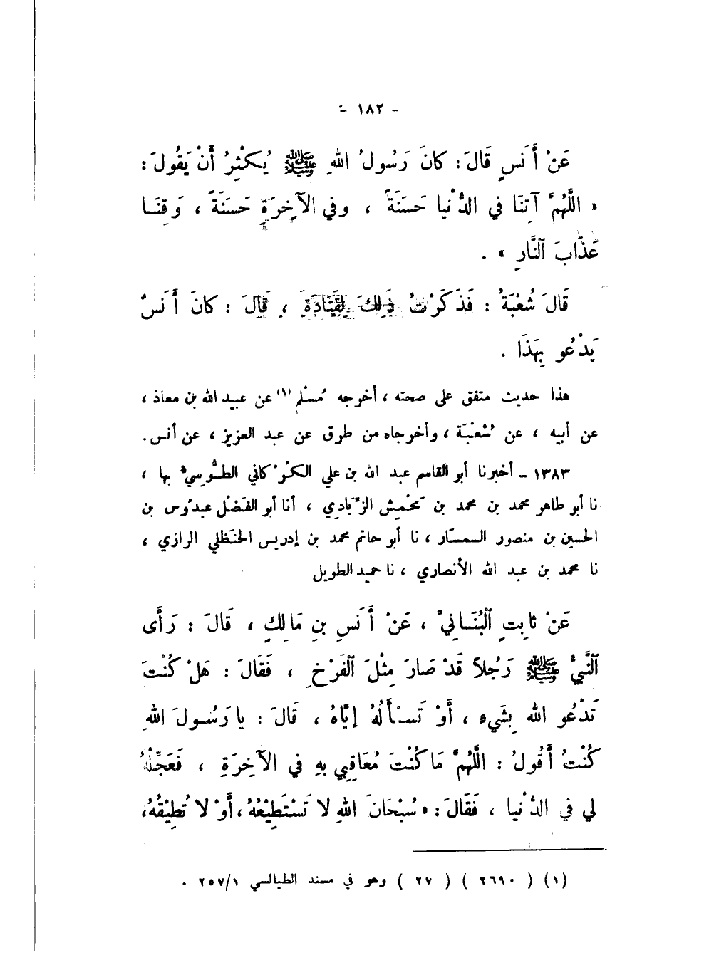 1383 - أَخْبَرَنَا أَبُو الْقَاسِمِ عَبْدُ اللَّهِ بْنُ عَلِيٍّ الْكُرْكَانِيُّ الطُّوسِيُّ، بِهَا، نَا أَبُو طَاهِرٍ مُحَمَّدُ بْنُ مُحَمَّدِ بْنِ مَحْمِشٍ الزِّيَادِيُّ، أَنا أَبُو الْفَضْلِ عَبْدُوسُ بْنُ الْحُسَيْنِ بْنِ مَنْصُورٍ السِّمْسَارُ، نَا أَبُو حَاتِمٍ مُحَمَّدُ بْنُ إِدْرِيسَ الْحَنْظَلِيُّ الرَّازِيُّ، نَا مُحَمَّدُ بْنُ عَبْدِ اللَّهِ الأَنْصَارِيُّ، نَا حُمَيْدٌ الطَّوِيلُ، عَنْ ثَابِتٍ الْبُنَانِيِّ، عَنْ أَنَسِ بْنِ مَالِكٍ، قَالَ: رَأَى النَّبِيُّ صَلَّى اللهُ عَلَيْهِ وَسَلَّمَ رَجُلا قَدْ صَارَ مِثْلَ الْفَرْخِ، فَقَالَ: «هَلْ كُنْتَ تَدْعُو اللَّهَ بِشَيْءٍ، أَوْ تَسْأَلُهُ إِيَّاهُ»، قَالَ يَا رَسُولَ اللَّهِ كُنْتُ أَقُولُ: اللَّهُمَّ مَا كُنْتَ مُعَاقِبِي بِهِ فِي الآخِرَةِ، فَعَجِّلْهُ لِي فِي الدُّنْيَا، فَقَالَ: " سُبْحَانَ اللَّهِ لَا تَسْتَطِيعُهُ، أَوْ لَا تُطِيقُهُ،