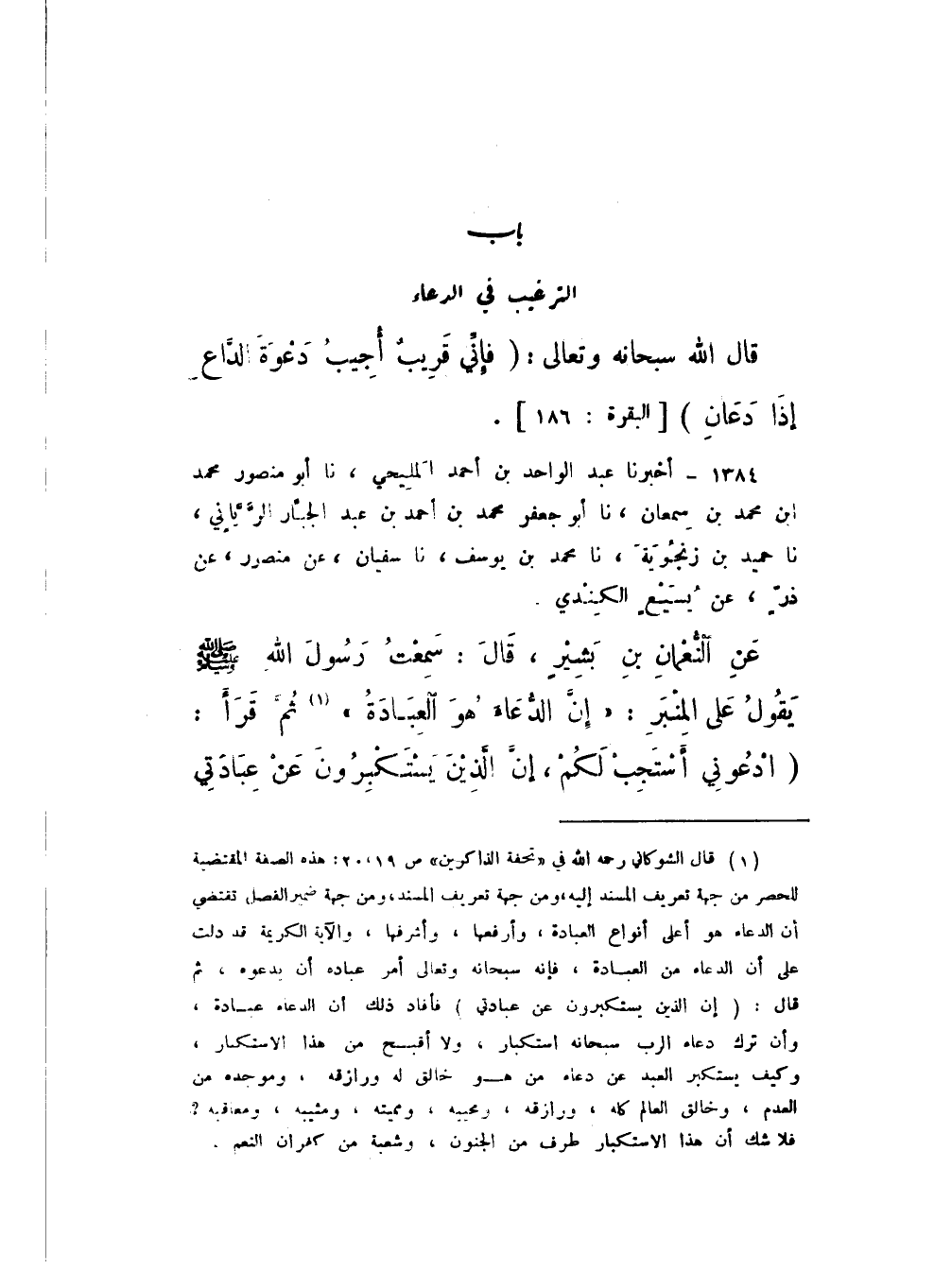 1384 - أَخْبَرَنَا عَبْدُ الْوَاحِدِ بْنُ أَحْمَدَ الْمَلِيحِيُّ، نَا أَبُو مَنْصُورٍ مُحَمَّدُ بْنُ مُحَمَّدِ بْنِ سَمْعَانَ، نَا أَبُو جَعْفَرٍ مُحَمَّدُ بْنُ أَحْمَدَ بْنِ عَبْدِ الْجَبَّارِ الرَّيَّانِيُّ، نَا حُمَيْدُ بْنُ زَنْجُوَيْهِ، نَا مُحَمَّدُ بْنُ يُوسُفَ، نَا سُفْيَانُ، عَنْ مَنْصُورٍ، عَنْ ذَرٍّ، عَنْ يُسَيْعٍ الْكِنْدِيِّ، عَنِ النُّعْمَانِ بْنِ بَشِيرٍ، قَالَ: سَمِعْتُ رَسُولَ اللَّهِ صَلَّى اللهُ عَلَيْهِ وَسَلَّمَ، يَقُولُ عَلَى الْمِنْبَرِ: «إِنَّ الدُّعَاءَ هُوَ الْعِبَادَةُ»، ثُمَّ قَرَأَ: {ادْعُونِي أَسْتَجِبْ لَكُمْ إِنَّ الَّذِينَ يَسْتَكْبِرُونَ عَنْ عِبَادَتِي