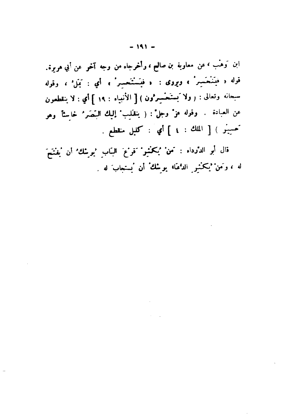 قَالَ أَبُو الدَّرْدَاءِ: مَنْ يُكْثِرْ قَرْعَ الْبَابِ يُوشِكْ أَنْ يُفْتَحَ لَهُ، وَمَنْ يُكْثِرِ الدُّعَاءَ يُوشِكْ أَنْ يُسْتَجَابَ لَهُ.