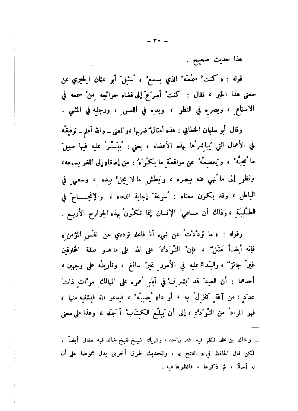 وَقَوْلُهُ: «مَا تَرَدَّدْتُ عَنْ شَيْءٍ أَنَا فَاعِلُهُ تَرَدُّدِي عَنْ نَفْسِ الْمُؤْمِنِ» فَإِنَّهُ أَيْضًا مَثَلٌ، فَإِنَّ التَّرَدُّدَ عَلَى اللَّهِ تَعَالَى عَلَى مَا هُوَ صِفَةُ الْمَخْلُوقِينَ غَيْرُ جَائِزٍ، وَالْبَدَاءُ عَلَيْهِ فِي الأُمُورِ غَيْرُ سَائِغٍ، وَتَأْوِيلُهُ عَلَى وَجْهَيْنِ، أَحَدُهُمَا: أَنَّ الْعَبْدَ قَدْ يُشْرِفُ فِي أَيَّامِ عُمُرِهِ عَلَى الْمَهَالِكِ مَرَّاتٍ ذَاتَ عَدَدٍ: مِنْ آفَةٍ تَنْزِلُ بِهِ، أَوْ دَاءٍ يُصِيبُهُ، فَيَدْعُو اللَّهَ، فَيَشْفِيهِ مِنْهَا، فَهُوَ الْمُرَادُ مِنَ التَّرَدُّدِ، إِلَى أَنْ يَبْلُغَ الْكِتَابُ أَجَلَهُ، وَهَذَا عَلَى مَعْنَى