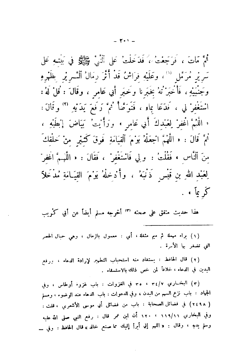 ثُمَّ مَاتَ، فَرَجَعْتُ، فَدَخَلْتُ عَلَى النَّبِيِّ صَلَّى اللهُ عَلَيْهِ وَسَلَّمَ فِي بَيْتِهِ عَلَى سَرِيرٍ مُرَمَّلٍ، وَعَلَيْهِ فِرَاشٌ قَدْ أَثَّرَ رمالُ السَّرِيرِ بِظَهْرِهِ وَجَنْبَيْهِ، فَأَخْبَرْتُهُ بِخَبَرِنَا وَخَبَرِ أَبِي عَامِرٍ، وَقَالَ: قُلْ لَهُ: اسْتَغْفِرْ لِي.