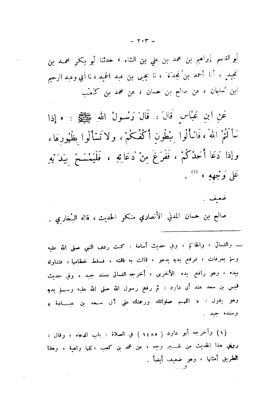 أَبُو الْقَاسِمِ إِبْرَاهِيمُ بْنُ مُحَمَّدِ بْنِ عَلِيِّ بْنِ الشَّاهِ، حَدَّثَنَا أَبُو بَكْرٍ مُحَمَّدُ بْنُ نَجِيدٍ، أَنا أَحْمَدُ بْنُ نُجْدَةَ، نَا يَحْيَى بْنُ عَبْدِ الْحَمِيدِ، نَا أَبِي، وَعَبْدُ الرَّحِيمِ بْنُ سُلَيْمَانَ، عَنْ صَالِحِ بْنِ حَسَّانٍ، عَنْ مُحَمَّدِ بْنِ كَعْبٍ، عَنِ ابْنِ عَبَّاسٍ، قَالَ: قَالَ رَسُولُ اللَّهِ صَلَّى اللهُ عَلَيْهِ وَسَلَّمَ: «إِذَا سَأَلْتُمُ اللَّهَ، فَاسْأَلُوا بِبُطُونِ أَكُفِّكُمْ، وَلا تَسْأَلُوا بِظُهُورِهَا، وَإِذَا دَعَا أَحَدُكُمْ، فَفَرَغَ مِنْ دُعَائِهِ، فَلْيَمْسَحْ بِيَدَيْهِ عَلَى وَجْهِهِ».