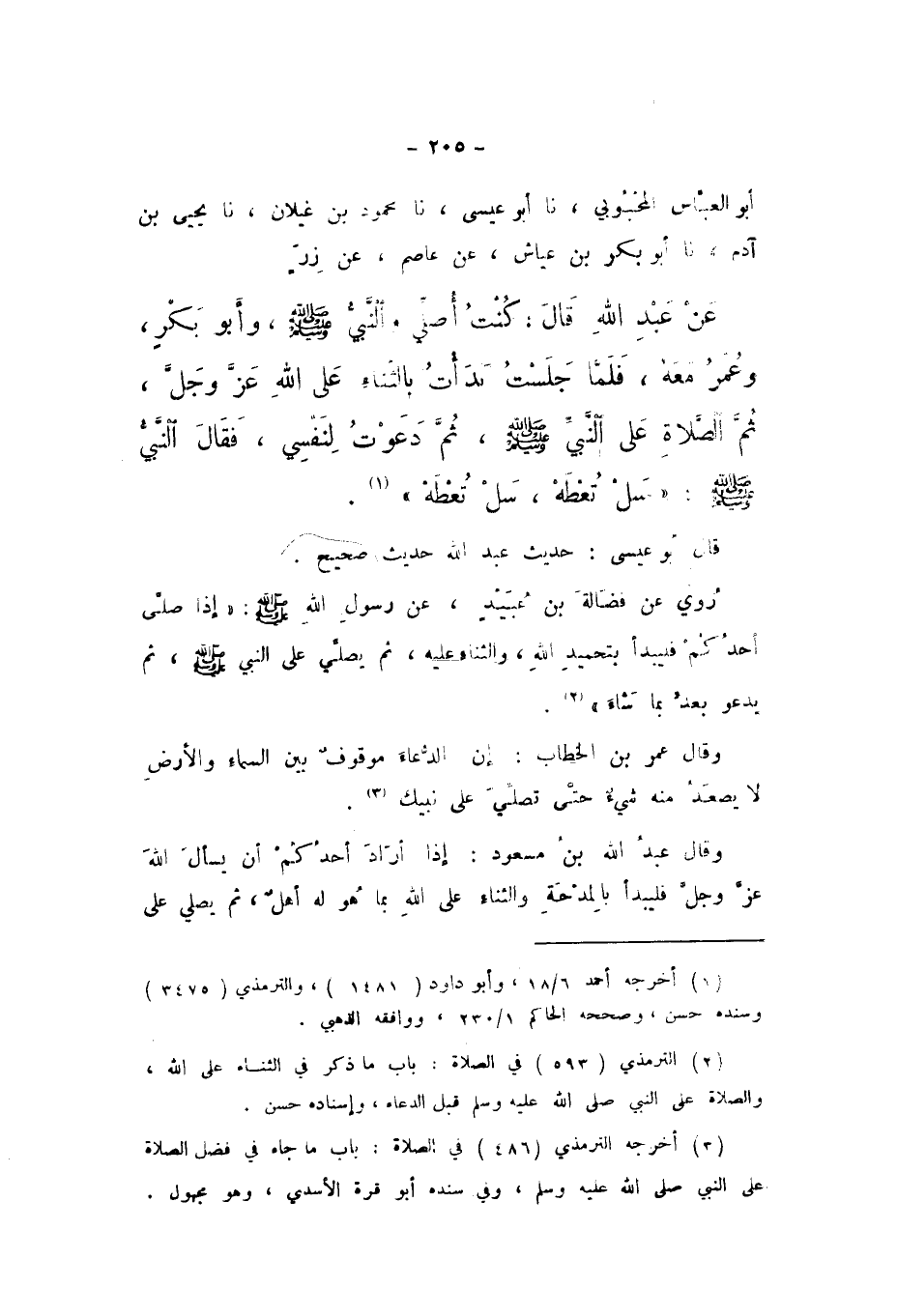 أَبُو الْعَبَّاسِ الْمَحْبُوبِيُّ، نَا أَبُو عِيسَى، نَا مَحْمُودُ بْنُ غَيْلانَ، نَا يَحْيَى بْنُ آدَمَ، نَا أَبُو بَكْرِ بْنُ عَيَّاشٍ، عَنْ عَاصِمٍ، عَنْ زِرٍّ، عَنْ عَبْدِ اللَّهِ، قَالَ: كُنْتُ أُصَلِّي , وَالنَّبِيُّ صَلَّى اللهُ عَلَيْهِ وَسَلَّمَ، وَأَبُو بَكْرٍ، وَعُمَرُ مَعَهُ، فَلَمَّا جَلَسْتُ، بَدَأْتُ بِالثَّنَاءِ عَلَى اللَّهِ عَزَّ وَجَلَّ، ثُمَّ الصَّلاةِ عَلَى النَّبِيِّ صَلَّى اللهُ عَلَيْهِ وَسَلَّمَ، ثُمَّ دَعَوْتُ لِنَفْسِي، فَقَالَ النَّبِيُّ صَلَّى اللهُ عَلَيْهِ وَسَلَّمَ: «سَلْ تُعْطَهْ، سَلْ تُعْطَهْ».