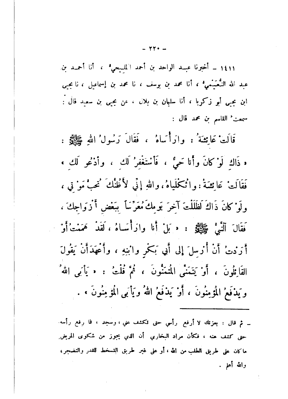 1411 - أَخْبَرَنَا عَبْدُ الْوَاحِدِ بْنُ أَحْمَدَ الْمَلِيحِيُّ، أَنا أَحْمَدُ بْنُ عَبْدِ اللَّهِ النُّعَيْمِيُّ، أَنا مُحَمَّدُ بْنُ يُوسُفَ، نَا مُحَمَّدُ بْنُ إِسْمَاعِيلَ، نَا يَحْيَى بْنُ يَحْيَى أَبوْ زَكَرِيَّا، أَنا سُلَيْمَانُ بْنُ بِلالٍ، عَنْ يَحْيَى بْنِ سَعْدٍ، قَالَ: سَمِعْتُ الْقَاسِمَ بْنَ مُحَمَّدٍ، قَالَ: قَالَتْ عَائِشَةُ: وَارَأْسَاهُ.