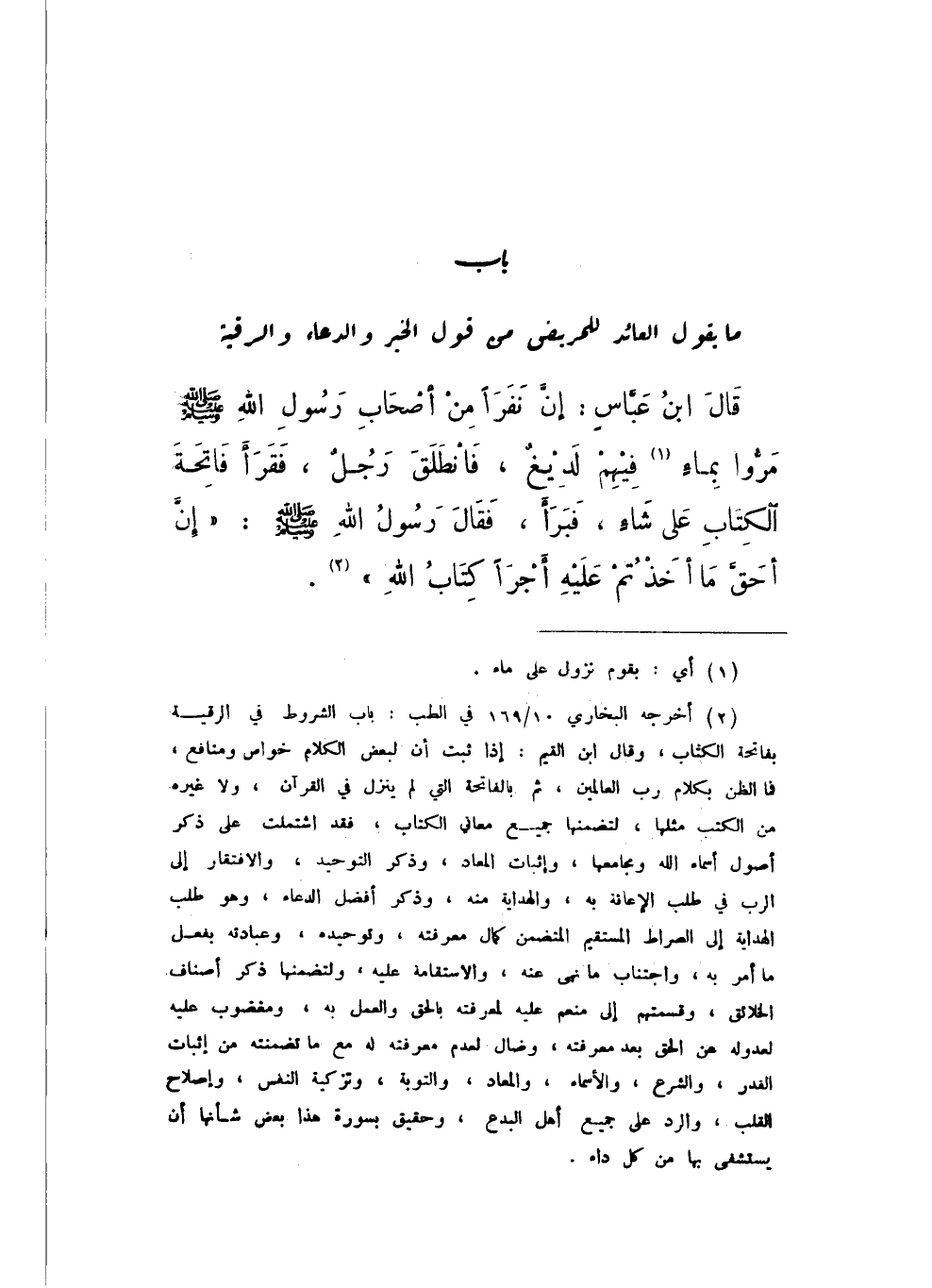 قَالَ ابْنُ عَبَّاسٍ: إِنَّ نَفَرًا مِنْ أصْحَابِ رَسُولِ اللَّهِ صَلَّى اللهُ عَلَيْهِ وَسَلَّمَ مَرُّوا بِمَاءٍ فِيهِمْ لَدِيغٌ، فَانْطَلَقَ رَجُلٌ، فَقَرَأَ فَاتِحَةَ الْكِتَابِ عَلَى شَاءٍ، فَبَرَأَ، فَقَالَ رَسُولُ اللَّهِ صَلَّى اللهُ عَلَيْهِ وَسَلَّمَ: «إِنَّ أَحَقَّ مَا أَخَذْتُمْ عَلَيْهِ أَجْرًا كِتَابُ اللَّهِ».