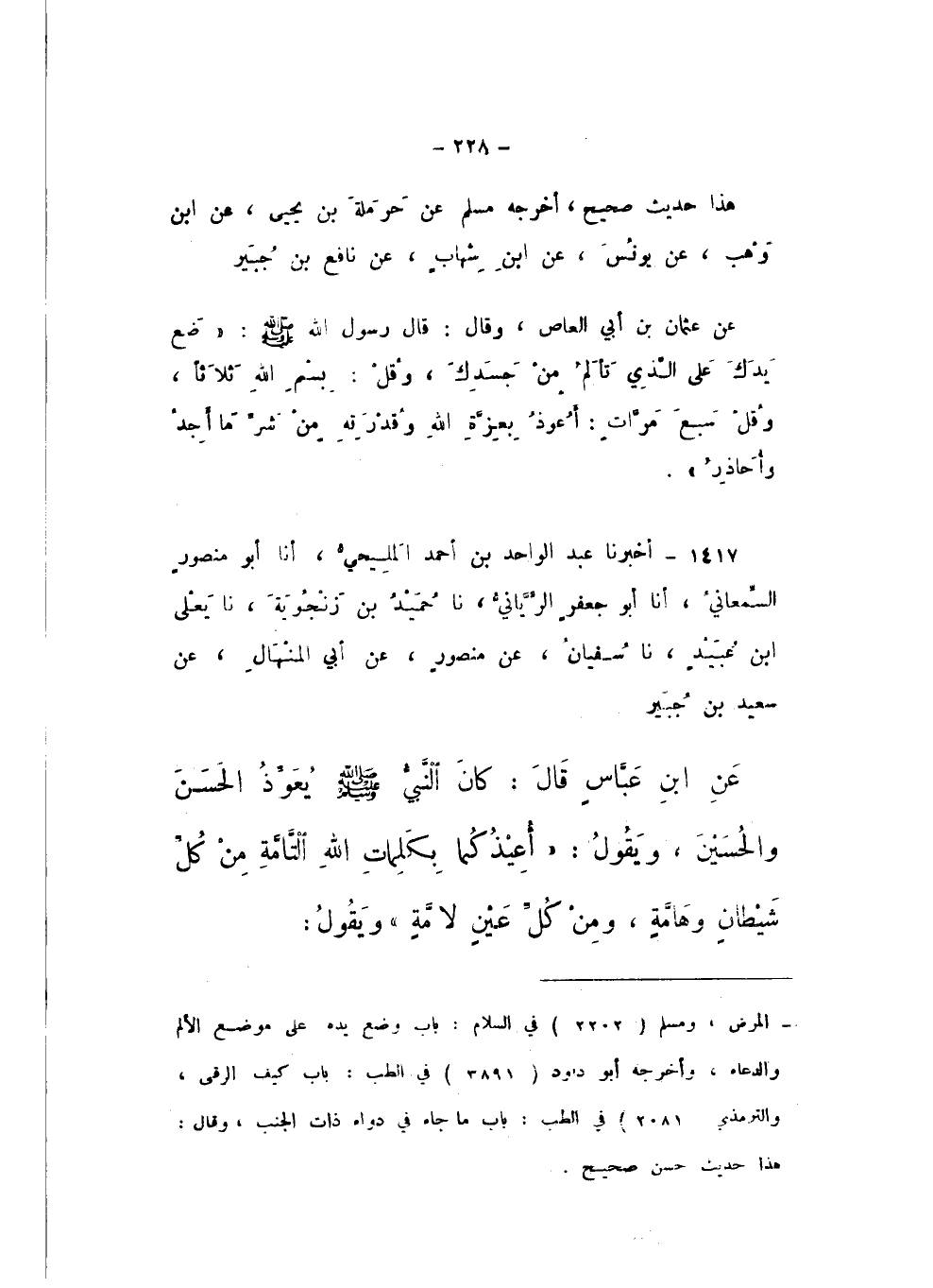 1417 - أَخْبَرَنَا عَبْدُ الْوَاحِدِ بْنُ أَحْمَدَ الْمَلِيحِيُّ، أَنا أَبُو مَنْصُورٍ السَّمْعَانِيُّ، أَنا أَبُو جَعْفَرٍ الرَّيَّانِيُّ، نَا حُمَيْدُ بْنُ زَنْجُوَيْهِ، نَا يَعْلَى بْنُ عُبَيْدٍ، نَا سُفْيَانُ، عَنْ مَنْصُورٍ، عَنْ أَبِي الْمِنْهَالِ، عَنْ سَعِيدِ بْنِ جُبَيْرٍ، عَنِ ابْنِ عَبَّاسٍ، قَالَ: كَانَ النَّبِيُّ صَلَّى اللهُ عَلَيْهِ وَسَلَّمَ يُعَوِّذُ الْحَسَنَ وَالْحُسَيْنَ، وَيَقُولُ: «أُعِيذُكُمَا بِكَلِمَاتِ اللَّهِ التَّامَّةِ مِنْ كُلِّ شَيْطَانٍ وَهَامَّةٍ، وَمِنْ كُلِّ عَيْنٍ لامَّةٍ».