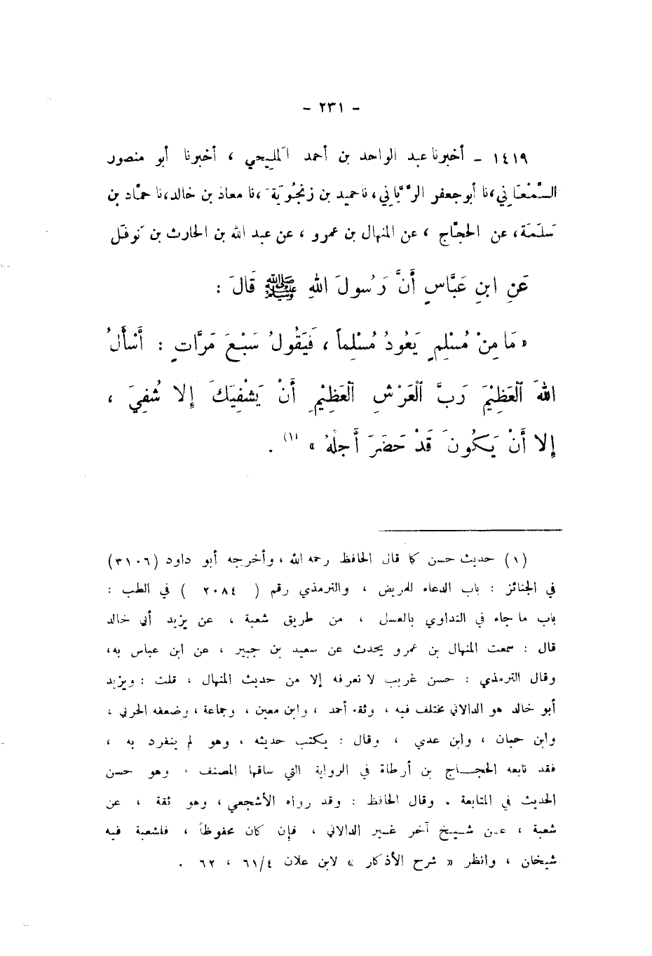 1419 - أَخْبَرَنَا عَبْدُ الْوَاحِدِ بْنُ أَحْمَدَ الْمَلِيحِيُّ، أَخْبَرَنَا أَبُو مَنْصُورٍ السَّمْعَانِيُّ، نَا أَبُو جَعْفَرٍ الرَّيَّانِيُّ، نَا حُمَيْدُ بْنُ زَنْجُوَيْهِ، نَا مُعَاذُ بْنُ خَالِدٍ، نَا حَمَّادُ بْنُ سَلَمَةَ، عَنِ الْحَجَّاجِ، عَنِ الْمِنْهَالِ بْنِ عَمْرٍو، عَنْ عَبْدِ اللَّهِ بْنِ الْحَارِثِ بْنِ نَوْفَلٍ، عَنِ ابْنِ عَبَّاسٍ، أَنّ رَسُولَ اللَّهِ صَلَّى اللهُ عَلَيْهِ وَسَلَّمَ، قَالَ: " مَا مِنْ مُسْلِمٍ يَعُودُ مُسْلِمًا، فَيَقُولُ سَبْعَ مَرَّاتٍ: أَسْأَلُ اللَّهَ الْعَظِيمَ رَبَّ الْعَرْشِ الْعَظِيمِ أَنْ يَشْفِيَكَ، إِلا شُفِيَ، إِلا أَنْ يَكُونَ قَدْ حَضَرَ أَجَلُهُ ".