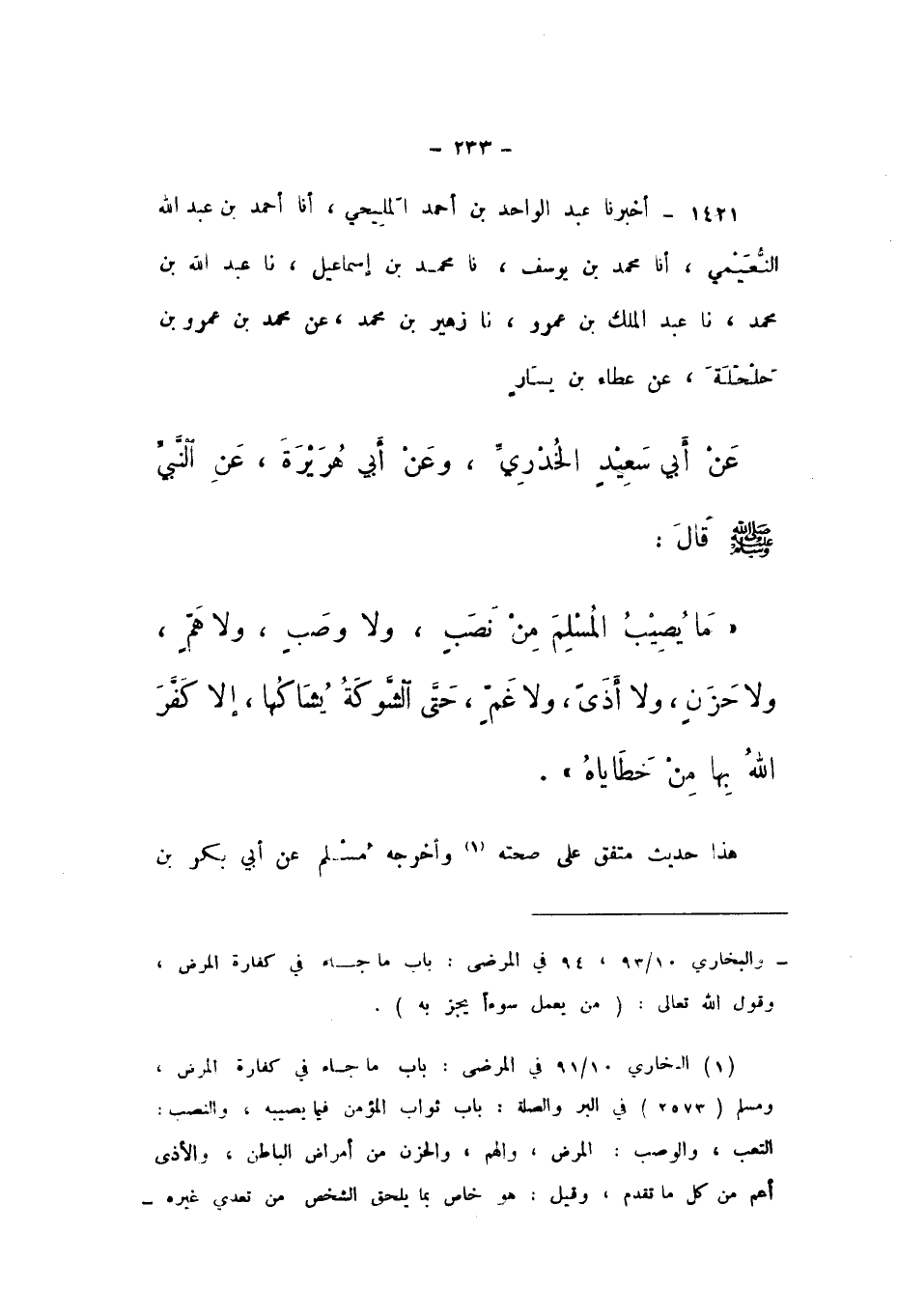 1421 - أَخْبَرَنَا عَبْدُ الْوَاحِدِ بْنُ أَحْمَدَ الْمَلِيحِيُّ، أَنا أَحْمَدُ بْنُ عَبْدِ اللَّهِ النُّعَيْمِيُّ، أَنا مُحَمَّدُ بْنُ يُوسُفَ، نَا مُحَمَّدُ بْنُ إِسْمَاعِيلَ، نَا عَبْدُ اللَّهِ بْنُ مُحَمَّدٍ، نَا عَبْدُ الْمَلِكِ بْنُ عَمْرٍو، نَا زُهَيْرُ بْنُ مُحَمَّدٍ، عَنْ مُحَمَّدِ بْنِ عَمْرِو بْنِ حَلْحَلَةَ، عَنْ عَطَاءِ بْنِ يَسَارٍ، عَنْ أَبِي سَعِيدٍ الْخُدْرِيِّ، وَعَنْ أَبِي هُرَيْرَةَ، عَنِ النَّبِيِّ صَلَّى اللهُ عَلَيْهِ وَسَلَّمَ، قَالَ: «مَا يُصِيبُ الْمُسْلِمَ مِنْ نَصَبٍ، وَلا وَصَبٍ، وَلا هَمٍّ، وَلا حَزَنٍ، وَلا أَذًى، وَلا غَمٍّ، حَتَّى الشَّوْكَةُ يُشَاكُهَا، إِلا كَفَّرَ اللَّهُ بِهَا مِنْ خَطَايَاهُ».