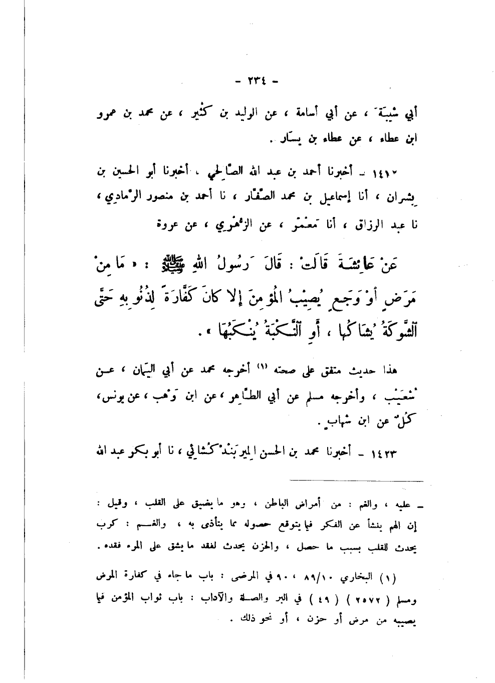 1422 - أَخْبَرَنَا أَحْمَدُ بْنُ عَبْدِ اللَّهِ الصَّالِحِيُّ، أَخْبَرَنَا أَبُو الْحُسَيْنِ بْنُ بِشْرَانَ، أَنا إِسْمَاعِيلُ بْنُ مُحَمَّدٍ الصَّفَّارُ، نَا أَحْمَدُ بْنُ مَنْصُورٍ الرَّمَادِيُّ، نَا عَبْدُ الرَّزَّاقِ، أَنا مَعْمَرٌ، عَنِ الزُّهْرِيِّ، عَنْ عُرْوَةَ، عَنْ عَائِشَةَ، قَالَتْ: قَالَ رَسُولُ اللَّهِ صَلَّى اللهُ عَلَيْهِ وَسَلَّمَ: «مَا مِنْ مَرَضٍ، أَوْ وَجَعٍ يُصِيبُ الْمُؤْمِنَ إِلا كَانَ كَفَّارَةً لِذُنُوبِهِ حَتَّى الشَّوْكَةُ يُشَاكُهَا، أَوِ النَّكْبَةُ يُنْكَبُهَا».