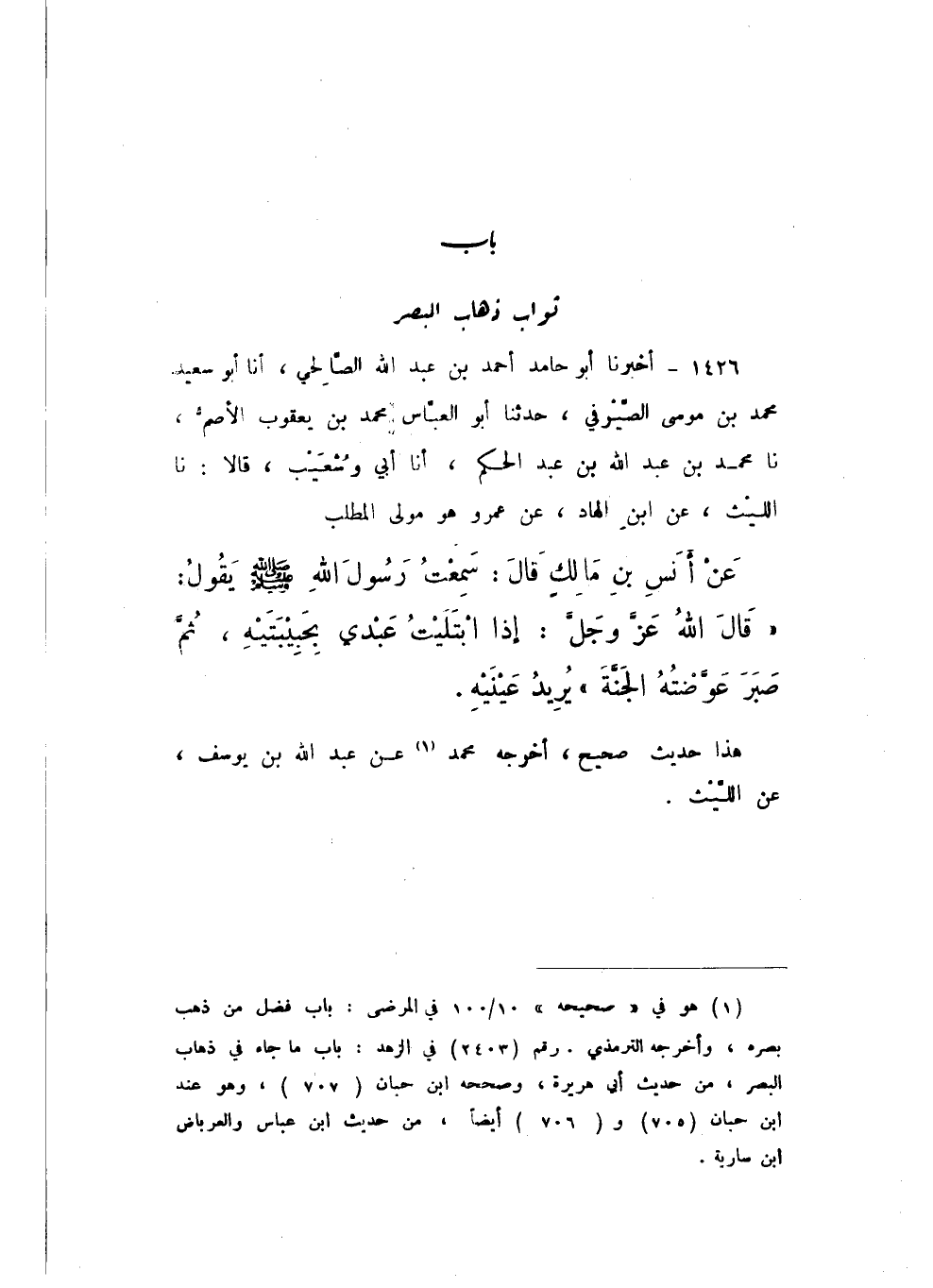 1426 - أَخْبَرَنَا أَبُو حَامِدٍ أَحْمَدُ بْنُ عَبْدِ اللَّهِ الصَّالِحِيُّ، أَنا أَبُو سَعِيدٍ مُحَمَّدُ بْنُ مُوسَى الصَّيْرَفِيُّ، حَدَّثَنَا أَبُو الْعَبَّاسِ مُحَمَّدُ بْنُ يَعْقُوبَ الأَصَمُّ، نَا مُحَمَّدُ بْنُ عَبْدِ اللَّهِ بْنِ عَبْدِ الْحَكَمِ، أَنا أَبِي، وَشُعَيْبٌ، قَالا: نَا اللَّيْثُ، عَنِ ابْنِ الْهَادِ، عَنْ عَمْرٍو هُوَ مَوْلَى الْمُطَّلِبِ، عَنْ أَنَسِ بْنِ مَالِكٍ، قَالَ: سَمِعْتُ رَسُولَ اللَّهِ صَلَّى اللهُ عَلَيْهِ وَسَلَّمَ، يَقُولُ: قَالَ اللَّهُ عَزَّ وَجَلَّ: «إِذَا ابْتَلَيْتُ عَبْدِي بِحَبِيبَتَيْهِ، ثُمَّ صَبَرَ عَوَّضْتُهُ الْجَنَّةَ» يُرِيدُ عَيْنَيْهِ.