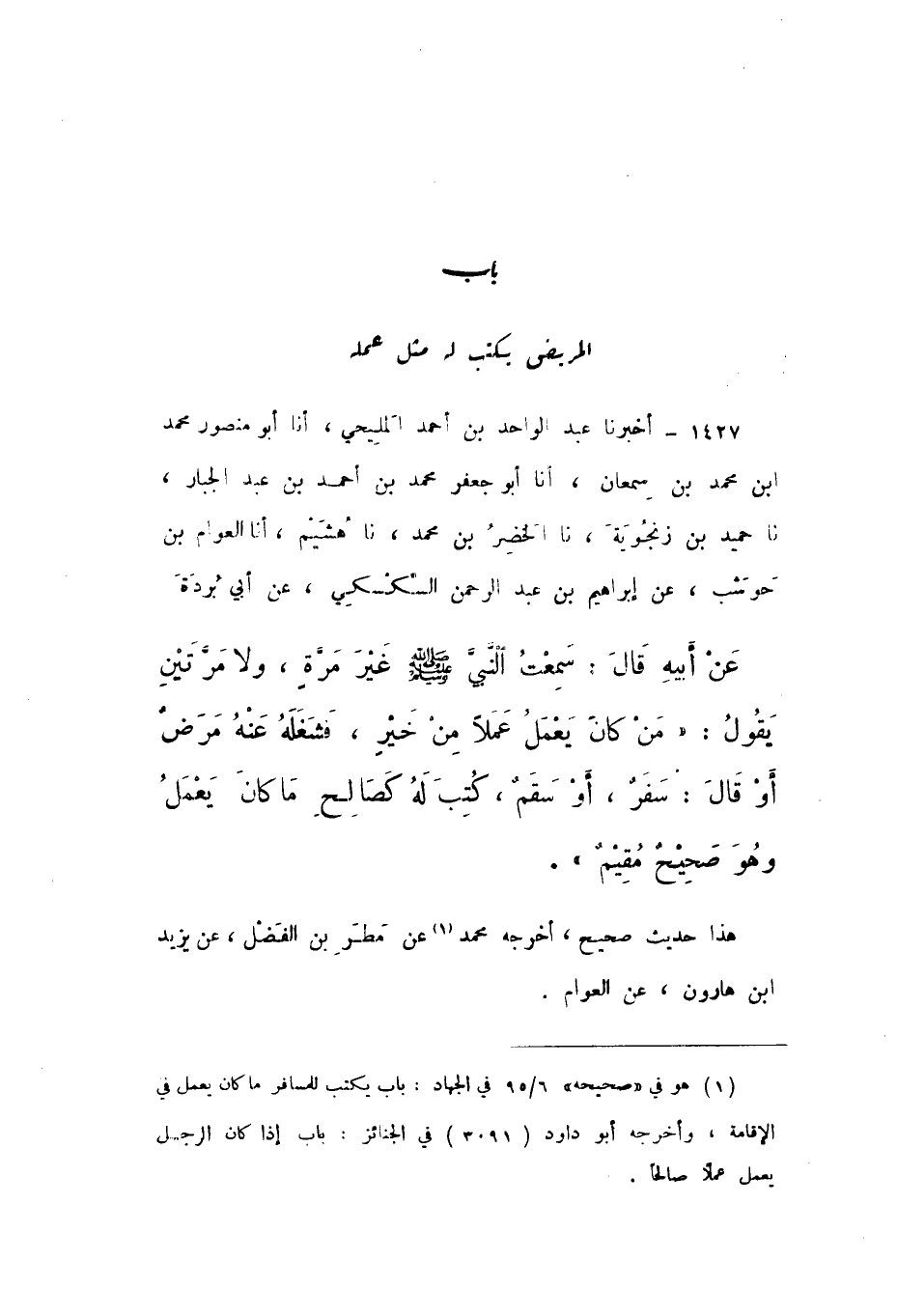 1427 - أَخْبَرَنَا عَبْدُ الْوَاحِدِ بْنُ أَحْمَدَ الْمَلِيحِيُّ، أَنا أَبُو مَنْصُورٍ مُحَمَّدُ بْنُ مُحَمَّدِ بْنِ سَمْعَانَ، أَنا أَبُو جَعْفَرٍ مُحَمَّدُ بْنُ أَحْمَدَ بْنِ عَبْدِ الْجَبَّارِ، نَا حُمَيْدُ بْنُ زَنْجُوَيْهِ، نَا الْخَضِرُ بْنُ مُحَمَّدٍ، نَا هُشَيْمٌ، أَنا الْعَوَّامُ بْنُ حَوْشَبٍ، عَنْ إِبْرَاهِيمَ بْنِ عَبْدِ الرَّحْمَنِ السَّكْسَكِيِّ، عَنْ أَبِي بُرْدَةَ، عَنْ أَبِيهِ، قَالَ: سَمِعْتُ النَّبِيَّ صَلَّى اللهُ عَلَيْهِ وَسَلَّمَ غَيْرَ مَرَّةٍ، وَلا مَرَّتَيْنِ يَقُولُ: " مَنْ كَانَ يَعْمَلُ عَمَلا مِنْ خَيْرٍ، فَشَغَلَهُ عَنْهُ مَرَضٌ، أَوْ قَالَ: سَفَرٌ، أَوْ سَقَمٌ، كُتِبَ لَهُ كَصَالِحِ مَا كَانَ يَعْمَلُ وَهُوَ صَحِيحٌ مُقِيمٌ ".