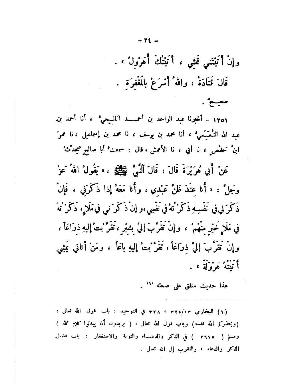 1251 - أَخْبَرَنَا عَبْدُ الْوَاحِدِ بْنُ أَحْمَدَ الْمَلِيحِيُّ، أَنا أَحْمَدُ بْنُ عَبْدِ اللَّهِ النُّعَيْمِيُّ، أَنا مُحَمَّدُ بْنُ يُوسُفَ، نَا مُحَمَّدُ بْنُ إِسْمَاعِيلَ، نَا عُمَرُ بْنُ حَفْصٍ، نَا أَبِي، نَا الأَعْمَشُ، قَالَ: سَمِعْتُ أَبَا صَالِحٍ، يُحَدِّثُ عَنْ أَبِي هُرَيْرَةَ، قَالَ: قَالَ النَّبِيُّ صَلَّى اللهُ عَلَيْهِ وَسَلَّمَ: " يَقُولُ اللَّهُ عَزَّ وَجَلَّ: أَنَا عِنْدَ ظَنِّ عَبْدِي، وَأَنَا مَعَهُ إِذَا ذَكَرَنِي، فَإِنْ ذَكَرَنِي فِي نَفْسِهِ ذَكَرْتُهُ فِي نَفْسِي، وَإِنْ ذَكَرَنِي فِي مَلإٍ، ذَكَرْتُهُ فِي مَلإٍ خَيْرٍ مِنْهُمْ، وَإِنْ تَقَرَّبَ إِلَيَّ بِشِبْرٍ، تَقَرَّبْتُ إِلَيْهِ ذِرَاعًا، وَإِنْ تَقَرَّبَ إِلَيَّ ذِرَاعًا، تَقَرَّبْتُ إِلَيْهِ بَاعًا، وَمَنْ أَتَانِي يَمْشِي أَتَيْتُهُ هَرْوَلَةً ".