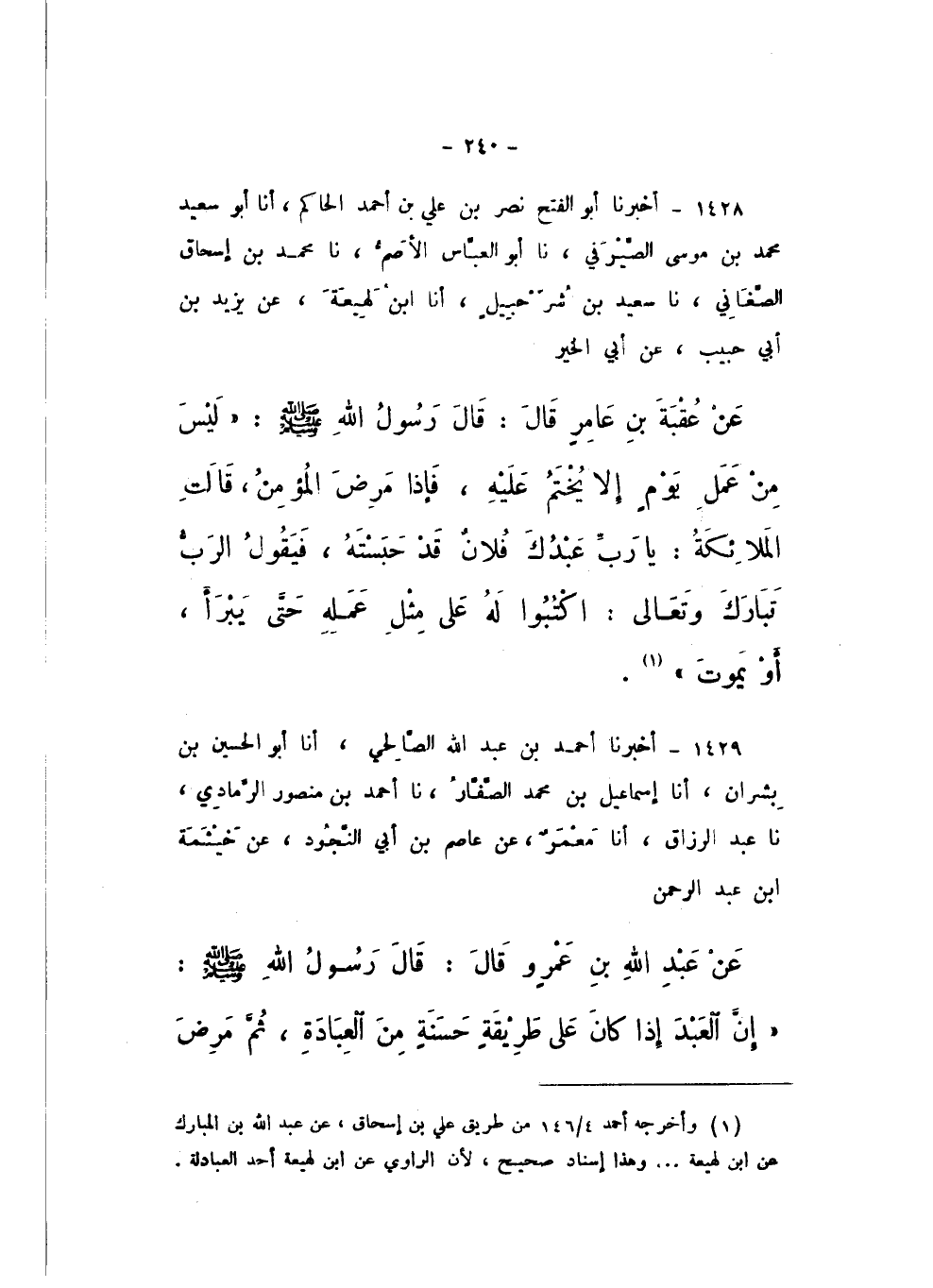 1428 - أَخْبَرَنَا أَبُو الْفَتْحِ نَصْرُ بْنُ عَلِيِّ بْنِ أَحْمَدَ الْحَاكِمُ، أَنا أَبُو سَعِيدٍ مُحَمَّدُ بْنُ مُوسَى الصَّيْرَفِيُّ، نَا أَبُو الْعَبَّاسِ الأَصَمُّ، نَا مُحَمَّدُ بْنُ إِسْحَاقَ الصَّغَانِيُّ، نَا سَعِيدُ بْنُ شُرَحْبِيلَ، أَنا ابْنُ لَهِيعَةَ، عَنْ يَزِيدَ بْنِ أَبِي حَبِيبٍ، عَنْ أَبِي الْخَيْرِ، عَنْ عُقْبَةَ بْنِ عَامِرٍ، قَالَ: قَالَ رَسُولُ اللَّهِ صَلَّى اللهُ عَلَيْهِ وَسَلَّمَ: " لَيْسَ مِنْ عَمَلِ يَوْمٍ إِلا يُخْتَمُ عَلَيْهِ، فَإِذَا مَرِضَ الْمُؤْمِنُ، قَالَتِ الْمَلائِكَةُ: يَا رَبُّ عَبْدُكَ فُلانٌ قَدْ حَبَسْتَهُ، فَيَقُولُ الرَّبُّ تَبَارَكَ وَتَعَالَى: اكْتُبُوا لَهُ عَلَى مِثْلِ عَمَلِهِ حَتَّى يَبْرَأَ، أَوْ يَمُوتَ "